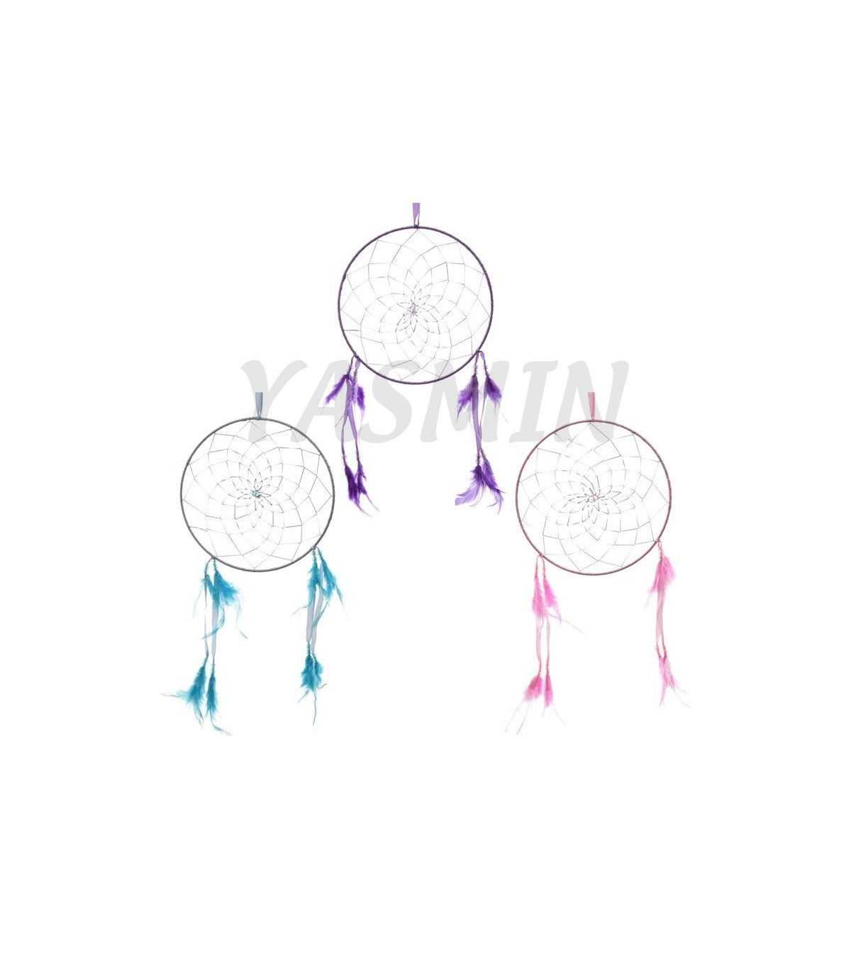 Atrapasueños con plumas y estructura del mismo color. Red de hilo color plata. Tamaño: 20 cms. diámetro. Colores a elegir.