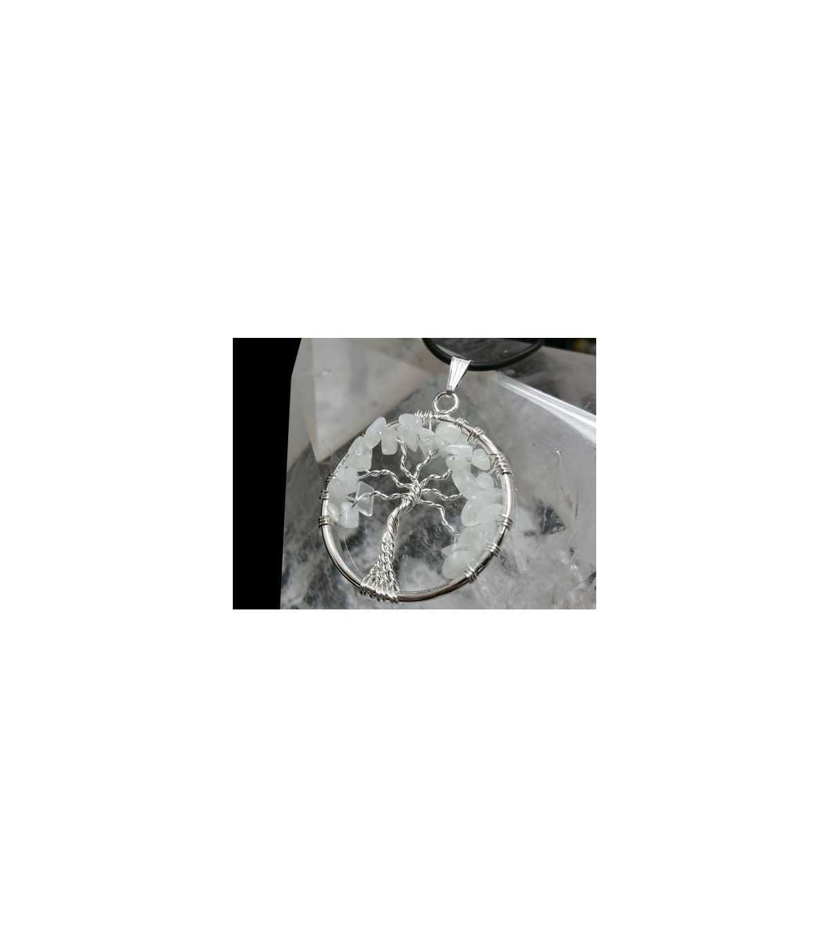 Colgante ÁRBOL DE LA VIDA, piedra luna en chips, en estructura metálica (no plata). El árbol de la vida es un amuleto con un profundo significado, ya que establece la comunicación entre los tres niveles del cosmos: el subterráneo, por sus raíces; la superficie de la tierra, por el tronco; y el cielo, por la copa y sus ramas. Es por tanto el eje que engloba la relación entre tierra y cielo. Tamaño 3,5 cms. diámetro.