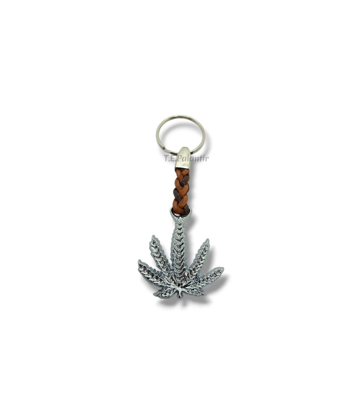 Llavero con figura de hoja de cannabis, metálico color plata. Unión con cuero trenzado de color marrón. Largo del llavero: 9 cms. aprox.
