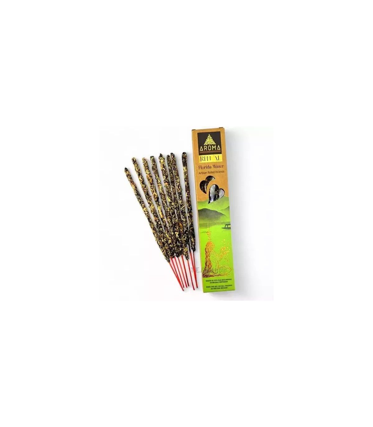 Incienso ritual Agua Florida, aroma natural que nos aportará tranquilidad y energía positiva. Estuche de 8 varillas gruesas de larga duración.