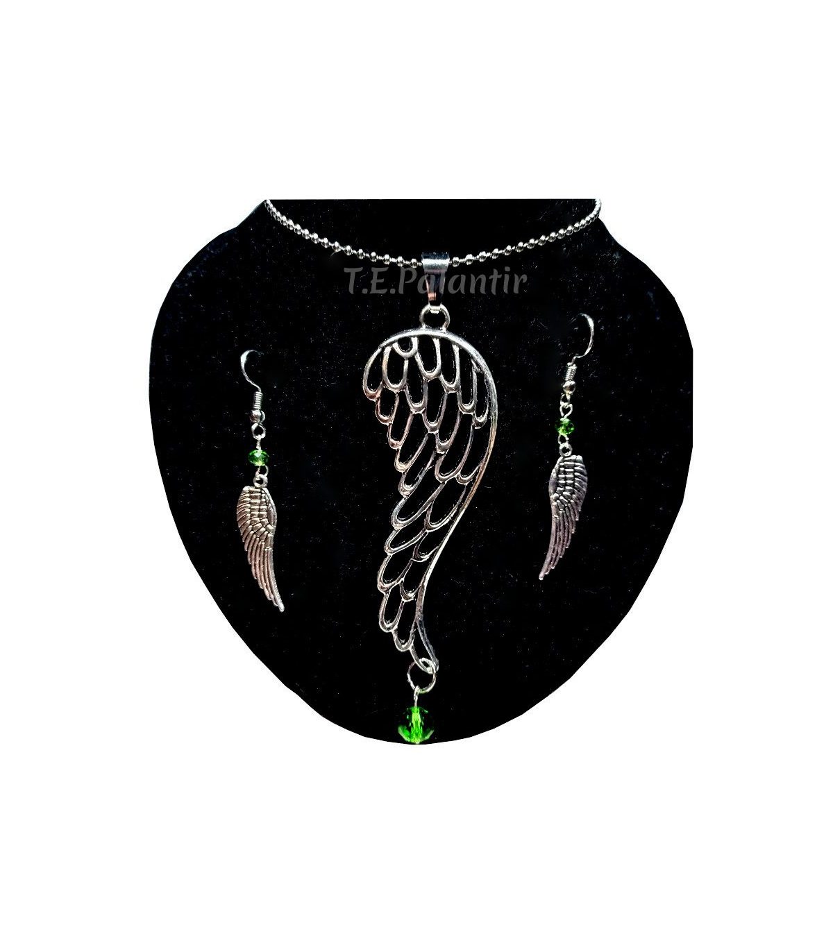 Conjunto formado por colgante collar largo y pendientes Ala de Ángel. Realizado en metal plateado y con cadena de acero inoxidable de 60 cm. de largo. Terminación con cristal de color (azul, rojo ó verde).
