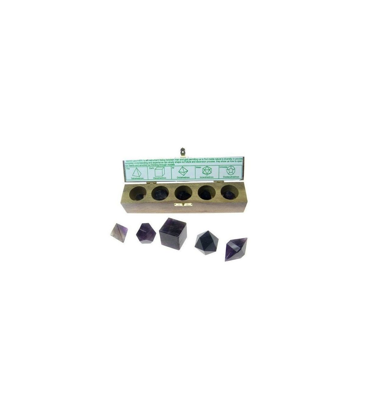 Estuche con 5 chakras sólidos platónicos en amatista