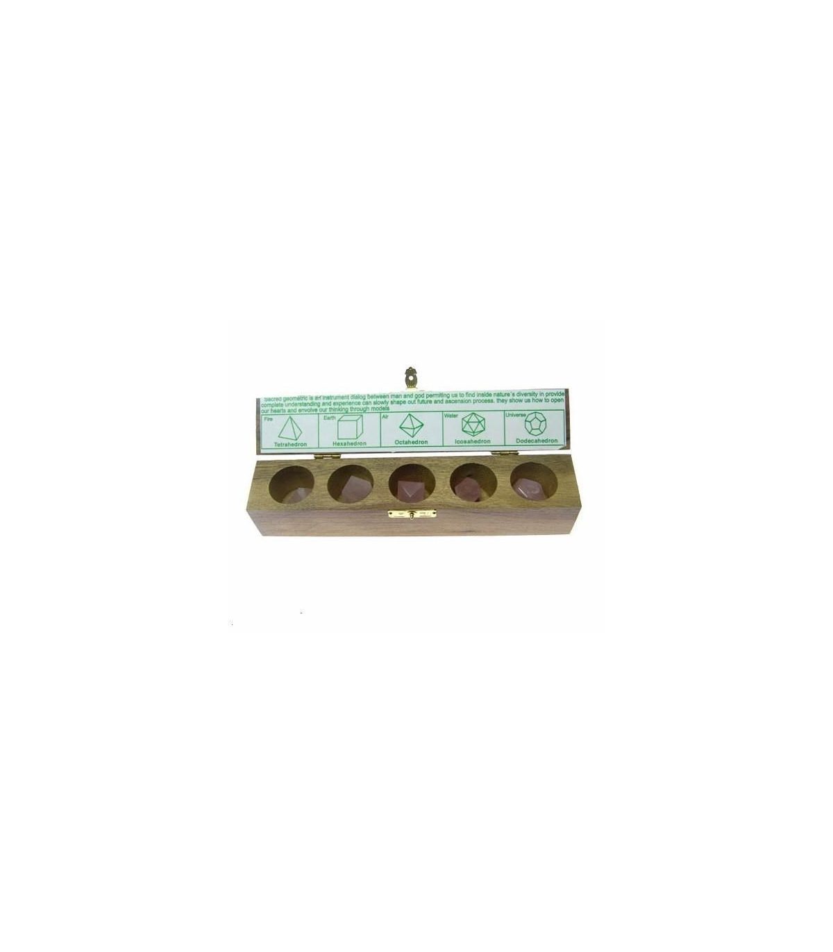 Estuche con 5 chakras sólidos platónicos en cuarzo rosa. Los chacras platónicos son otro método para equilibrar los puntos energéticos aunque aquí la relación no es por colores, sino por las formas geométricas y los elementos atmosféricos. Cada uno de estos cristales con formatos específicos trabaja atributos diferentes.