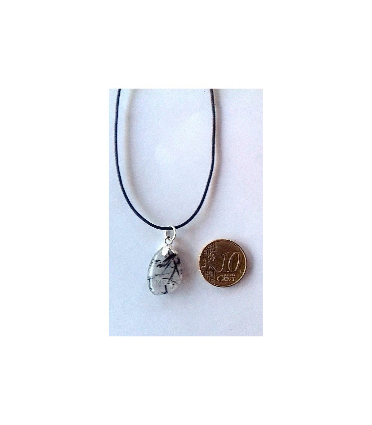 Colgante de rodado de cuarzo con turmalina, tamaño 20 mm. aprox. Enganche plata. Incluye cordón de algodón.