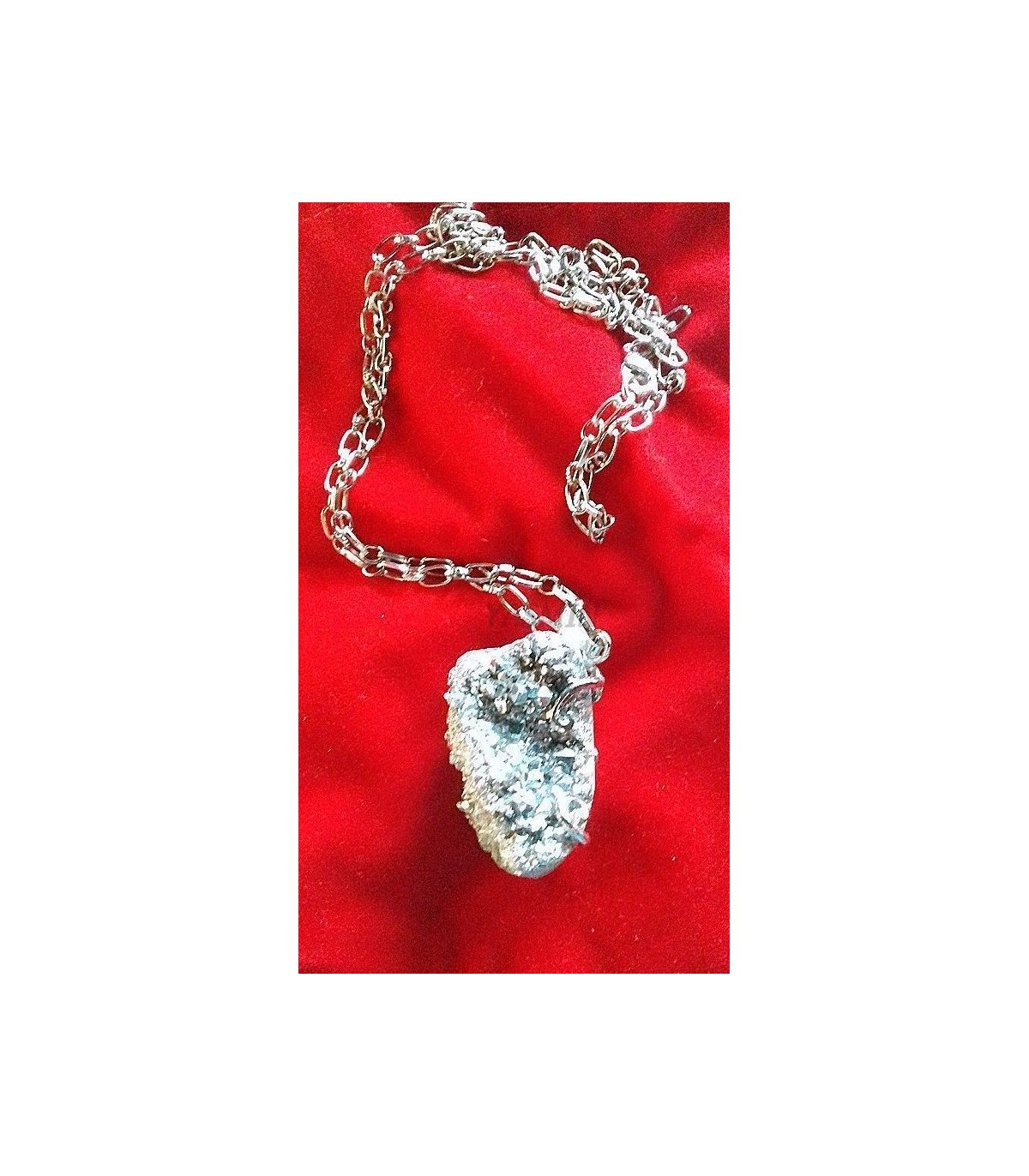 Colgante drusa cuarzo aqua aura con cadena plateada y cierre tipo mosquetón. Longitud cadena: 60 cms. abierta.