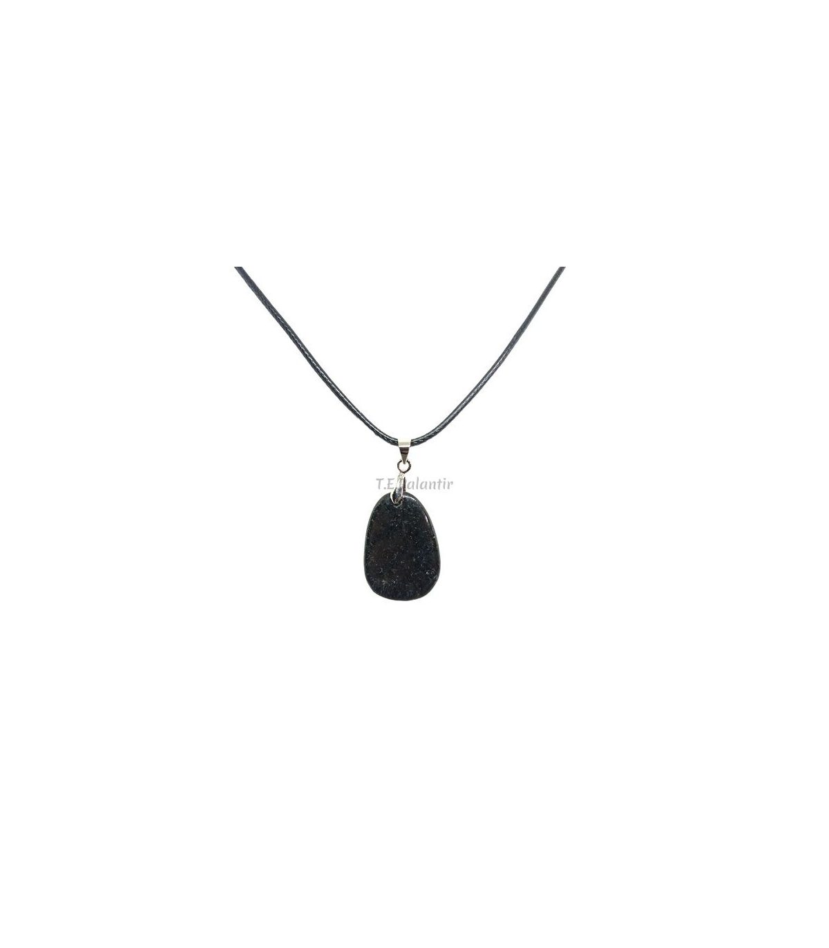 Colgante de Nuummita forma rodado plano ovalado. La Nuummita se conoce como la piedra de los hechiceros, proviene de Nuuk (Groenlandia), de ahí recibe su nombre. Es una piedra oscura, que al moverla puede ofrecer otras tonalidades, la más habitual la dorada.