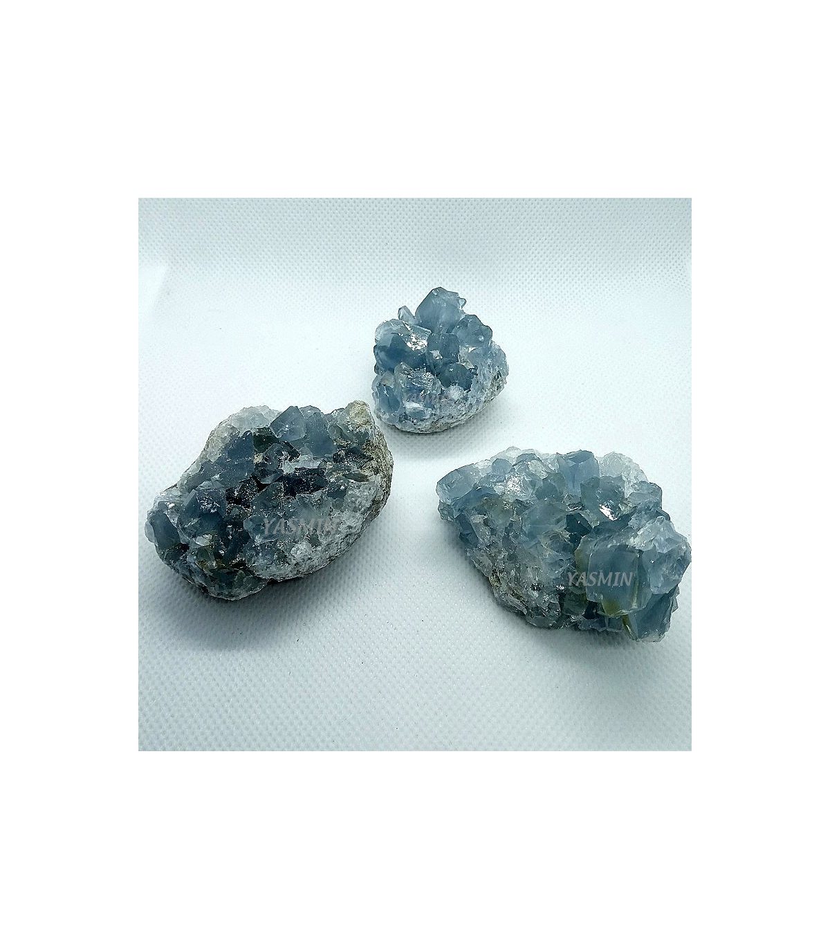 Drusa de celestina, tamaño variable (4-6 x 3-4 cms. aprox.). La celestina es una piedra espiritual. Nos ayuda a contactar con nuestro ángel guardián.