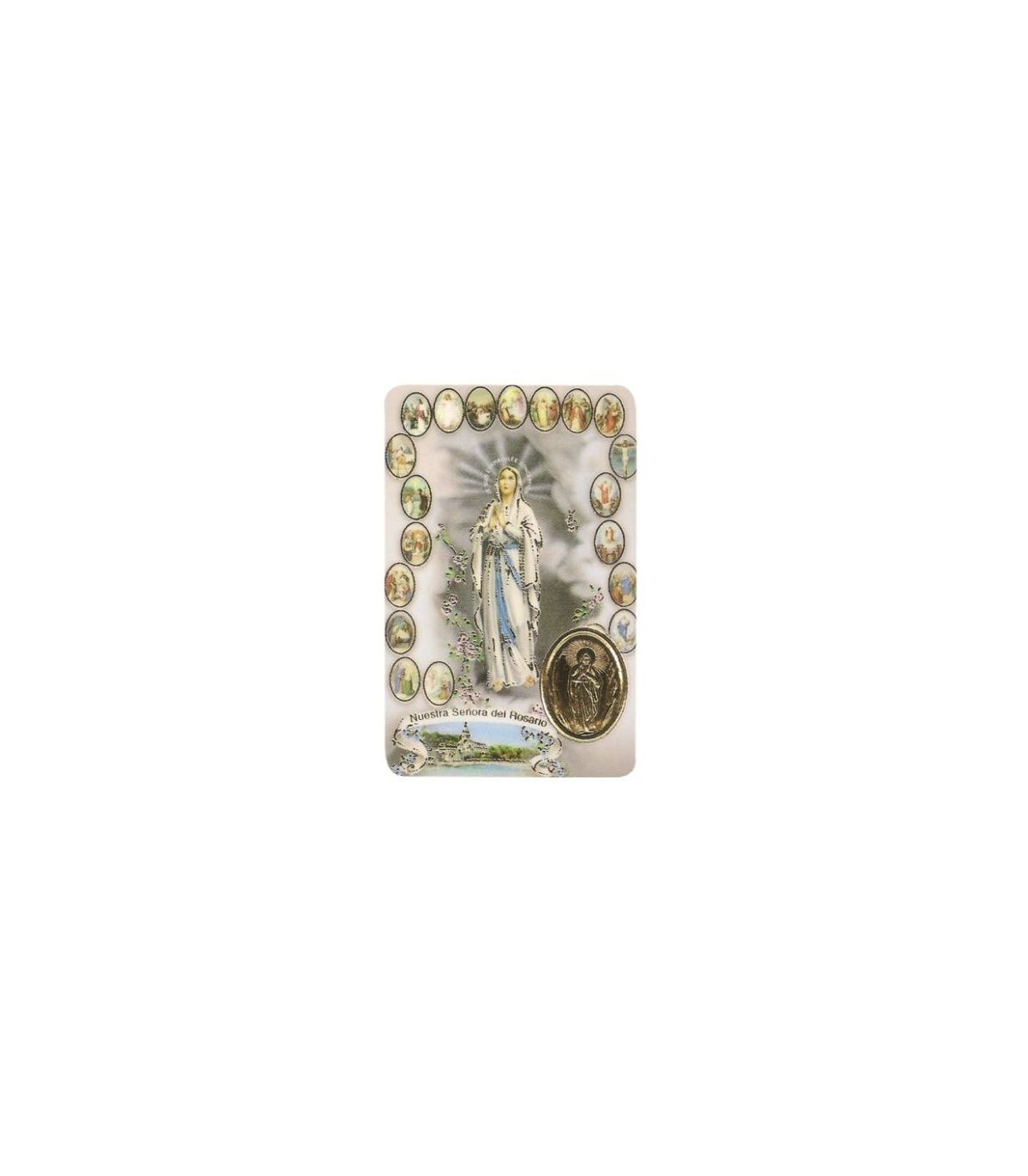 Estampa de Nuestra Señora del Rosario con medalla. Plastificada y con terminaciones en color dorado. Incluye oración en su reverso. Medidas: 85x54 mm.