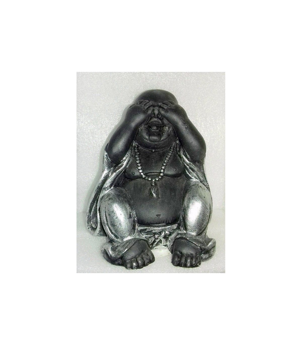 Figura Buda happy sentado. (Ver-Oir-Callar). Acabado color plateado y negro. Tamaño: 116x94x115 mm.