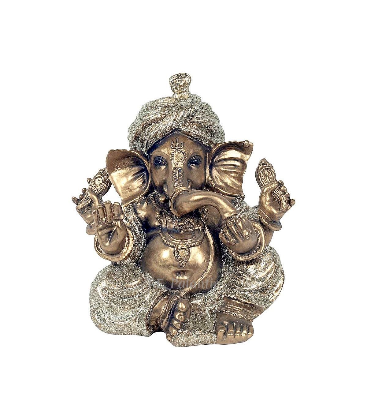 Ganesh sentado color dorado, fabricado en resina. Tamaño: 14x13x15 cms. Dios de los comerciantes. Amuleto de la suerte al iniciar cualquier proyecto.