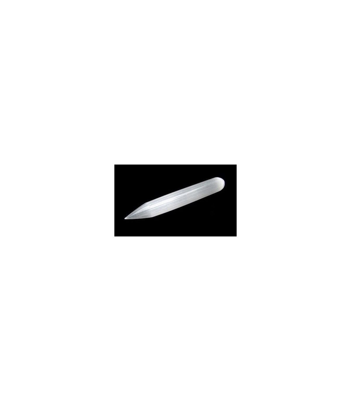 Masajeador de selenita tipo lápiz con acabado en punta en un extremo y redondeada en el opuesto. Con la punta se pueden trabajar manos y pies, y con la zona redondeada la espalda. Tamaño: 15 cms. largo x 2,5 cm. diámetro, aprox. Especial para terapias relajantes, muy adecuado para personas que padecen ansiedad.