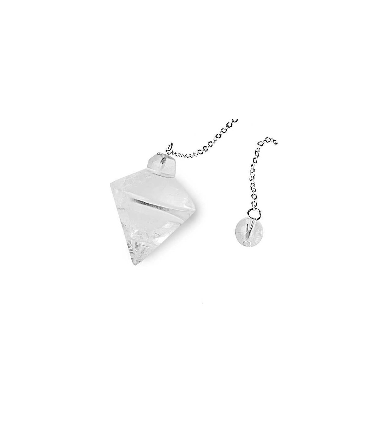 Péndulo de cuarzo cristal de roca (trasparente) forma cónica. Engarzado con cadena de acero de aproximadamente 200 mm. de largo. Medidas:aprox. 35 a 45 mm.