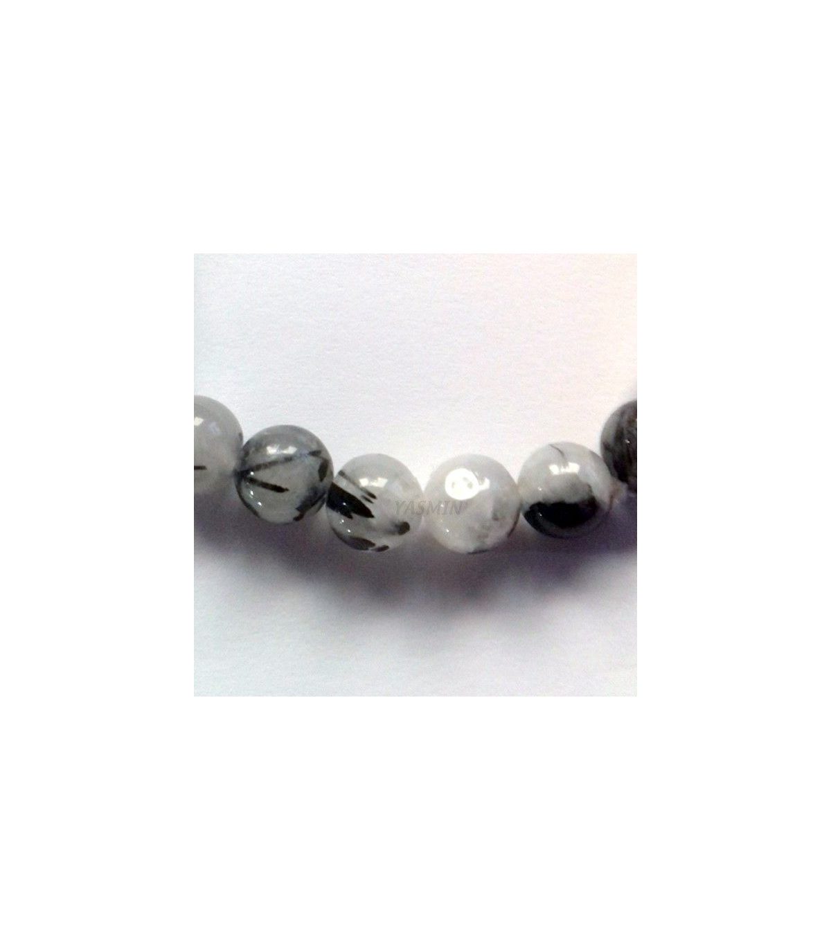 Pulsera de cuarzo turmalinado en bola lisa de 8 mm. El cuarzo turmalinado (cuarzo con incrustaciones internas de turmalina), es un tipo de cuarzo muy apreciado, ya que nos ofrece las propiedades del cuarzo y las de la turmalina en la misma pieza. Pulsera elástica adaptable.