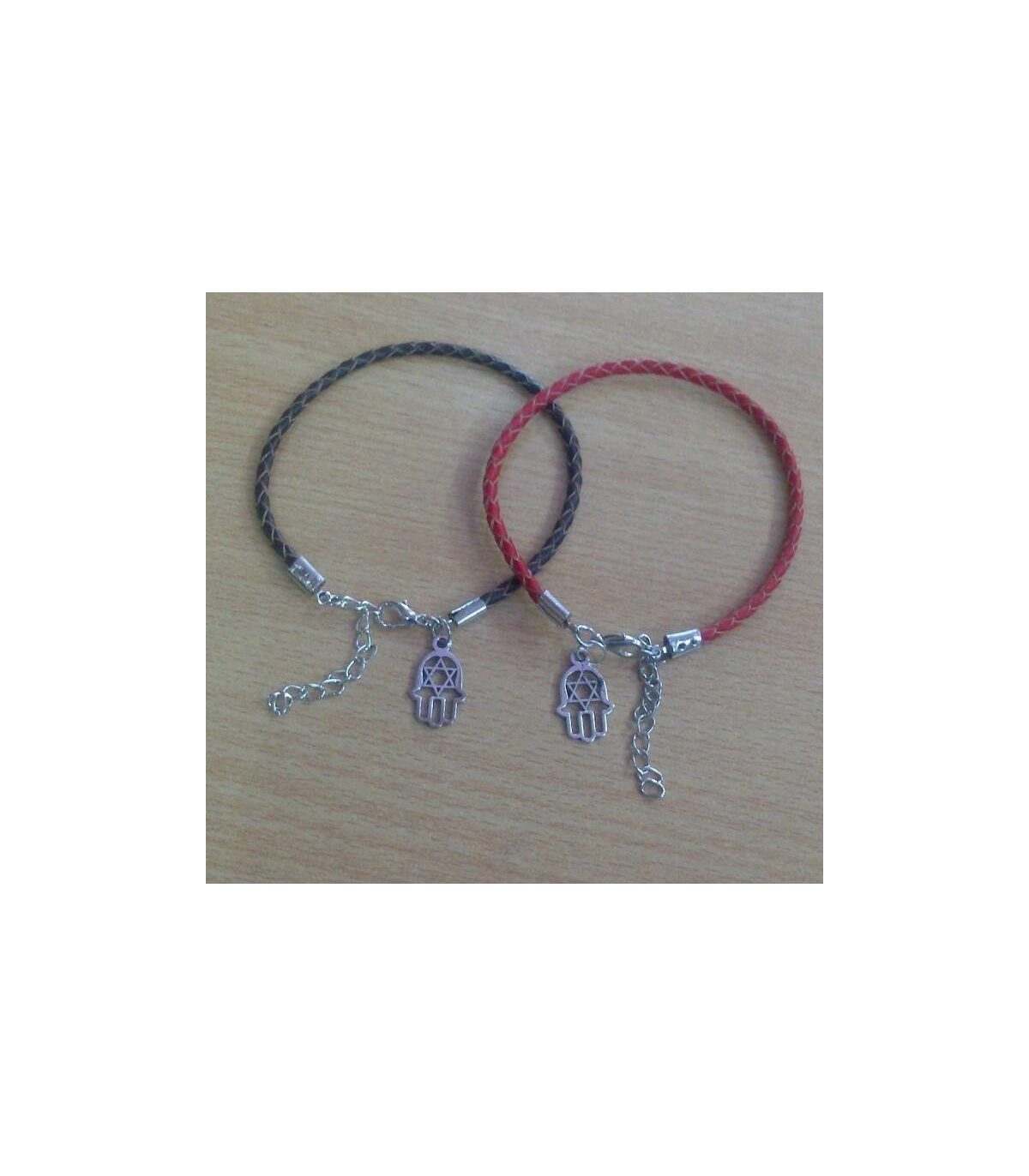 Pulsera realizada con cuero trenzado de 2 mm. de grosor, con amuleto Mano de Fátima con Estrella de David en su interior. Ambos son dos potentes amuletos protectores contra energías negativas, muy conocidos y venerados.