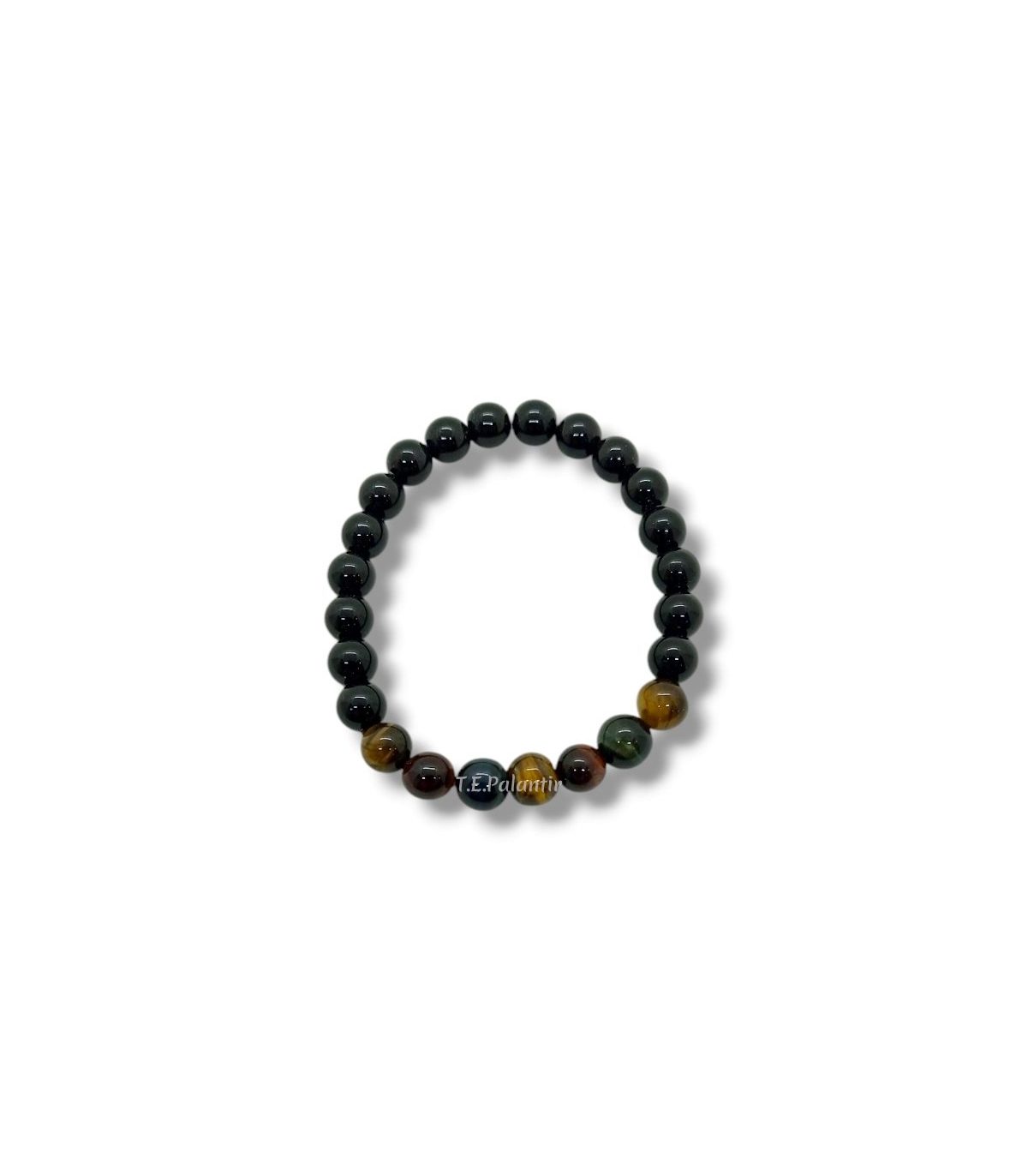 Pulsera de obsidiana negra y mix de 3 ojos (ojo de tigre, ojo de buey y ojo de halcón), bola de 8 mm, elástica. Cinco minerales que se complementan perfectamente haciendo de ésta una pulsera muy especial, además de ser exteriormente muy atractiva.
