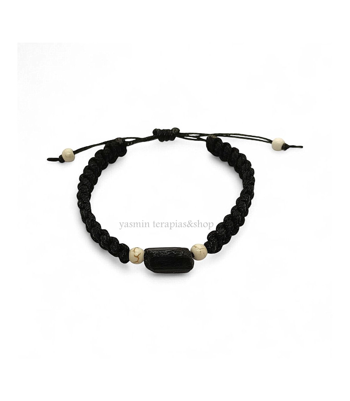 Pulsera con pieza de turmalina chorlo natural en el centro, ajustable tipo macramé color negro. La pieza de turmalina mide 15 mm. aproximadamente. Incluye bolas de magnesita blanca.