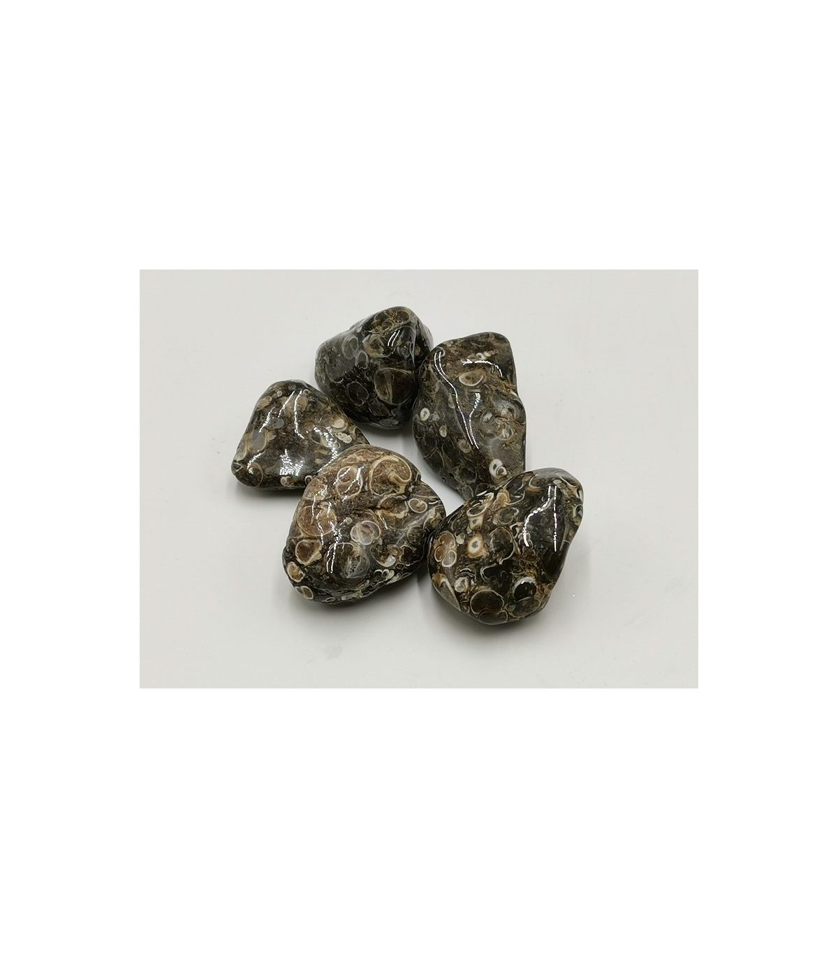Rodado de ágata turritella, tamaño aprox. 3 cms. Piedra de tono oscuro conocida como ágata fósil, ya que contiene fósiles gasterópodos (conchas y caracoles de mar).