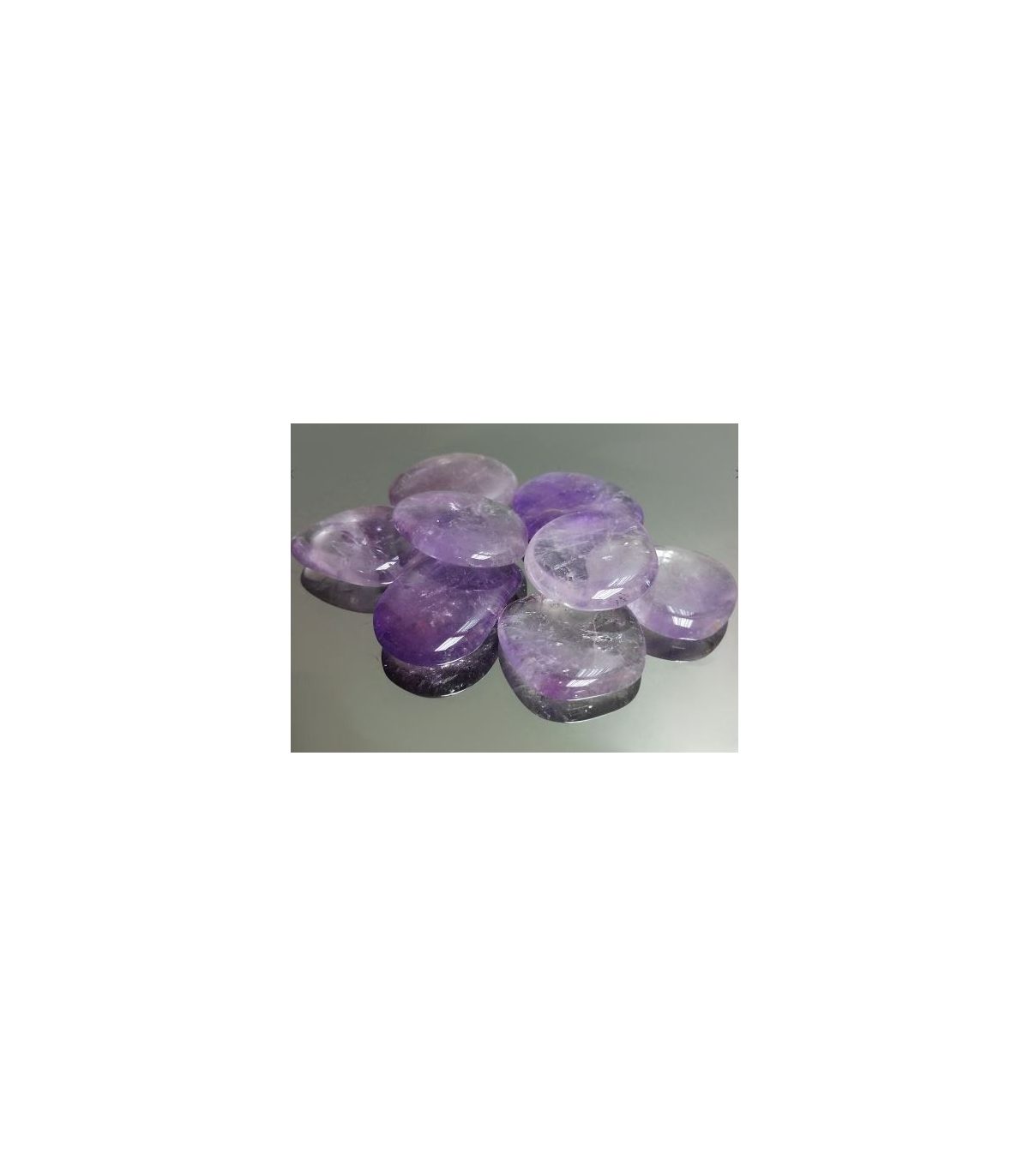 Rodado plano de AMATISTA. Piedra conocida también como "cuarzo morado". Es uno de los cuarzos básicos, es tranquilizadora, nos ayuda a controlar los malos pensamientos y aporta armonía en ambientes con discusiones frecuentes. Tamaño aprox. 40x30 mm. Precio por unidad