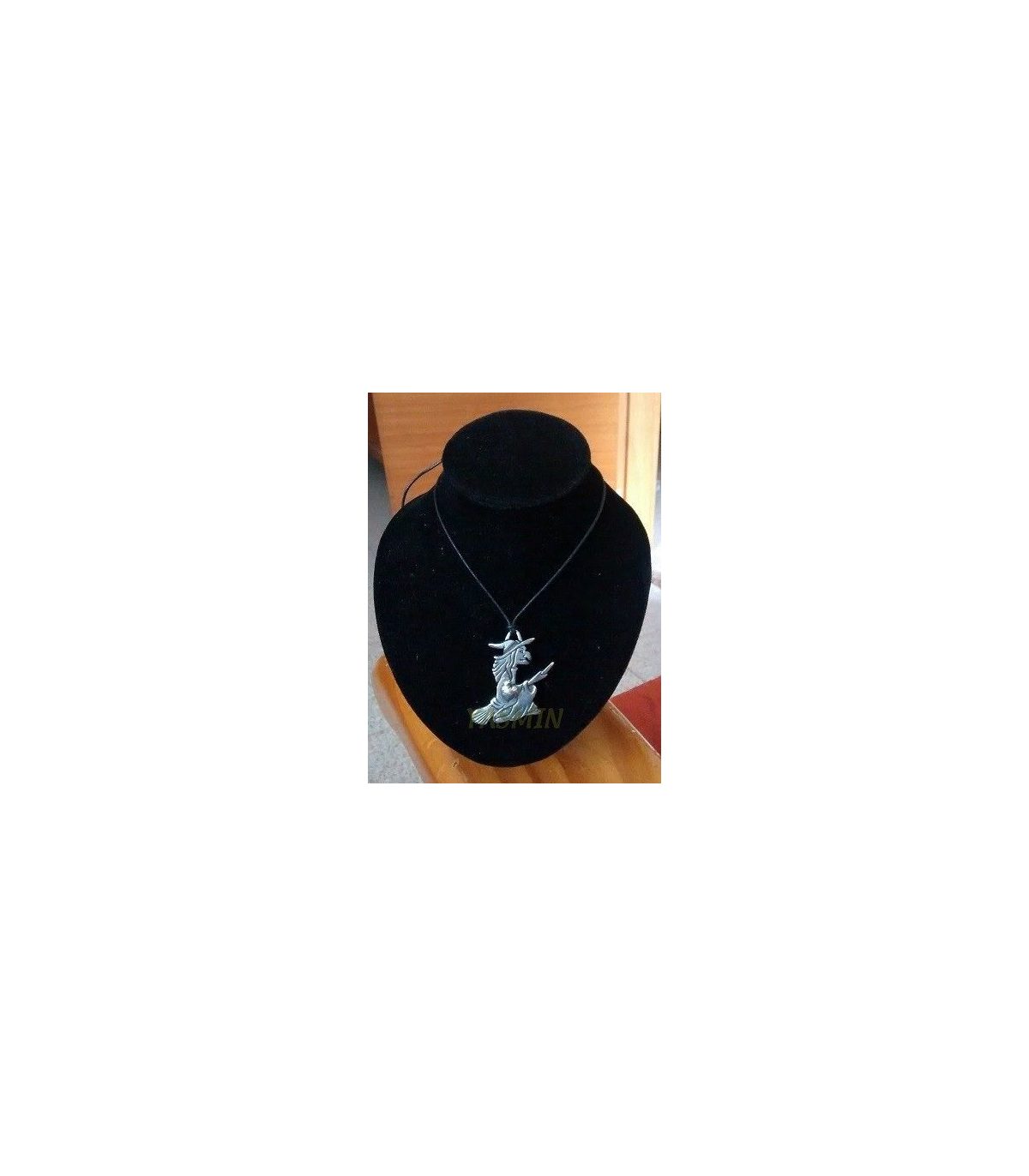 Colgante BRUJA EN ESCOBA, realizado en Zamak (aleación de zinc en un 85 %,aluminio, magnesio y cobre), recubierto con cobre y plata griega. La bruja simboliza la buenaventura y la protección, la bruja es pura suerte, es hechizo, es el símbolo de la magia de la mujer, de las antigüas diosas, de la mujer libre que vuela con su escoba y que supera todos los obstaculos que encuentra en su camino. La bruja de la suerte, aquella que va montando en su escoba representa la posibilidad de escapar de las adversidades y de la mala suerte. Es por ello que la bruja siempre trae consigo la buena suerte. Tamaño: 40x40 mm. aprox. Se entrega con cordón de algodón encerado y nudo ajustable.
