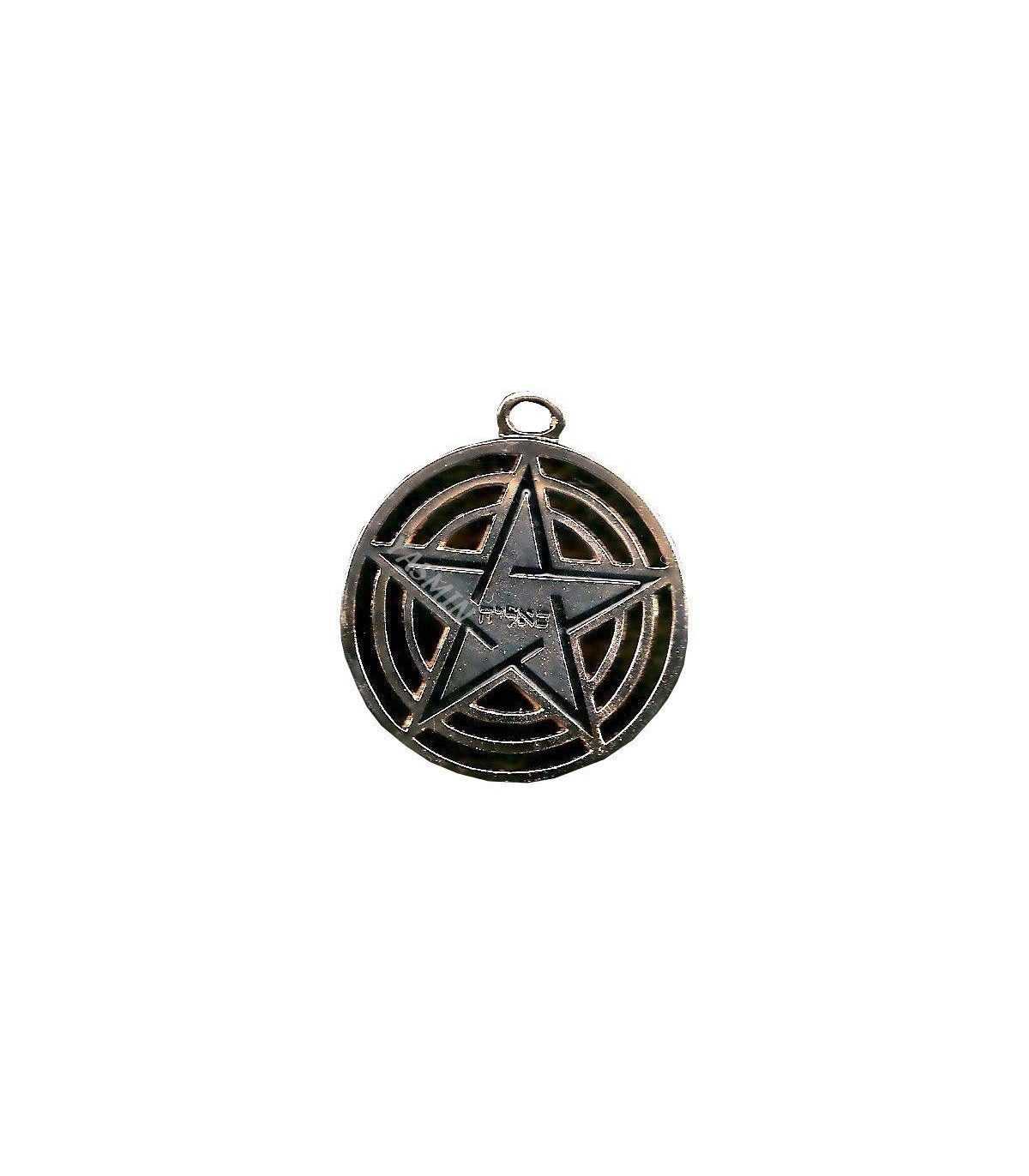 Medallón Pentagrama, realizado en zamak (aleación de zinc en un 85 %, aluminio, magnesio y cobre), y terminación en baño oro. El Pentagrama es también conocido como la estrella de la sabiduría, sello de Salomón, cruz de brujas y de los Druidas. Se considera como el símbolo mágico más utilizado y respetado. No se conoce su origen, pero sí que su procedencia es ancestral. Es un potente amuleto protector contra energías negativas, conjuros y nos proporciona seguridad y fuerza de voluntad para conseguir nuestros objetivos. Tamaño: 50 mm. diámetro Se entrega con cordón de algodón encerado y nudo ajustable.
