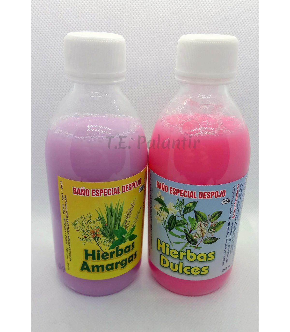 Pack de bain d'élimination herbes amères et d'herbes douces. Le bain d'élimination des herbes amères est particulièrement indiqué à utiliser lorsque nous voulons nous libérer des blocages et des énergies négatives qui nous dérangent dans notre vie quotidienne. Après son utilisation, nous utiliserons le bain d'élimination des herbes douces. Emballage de 250 ml chacun