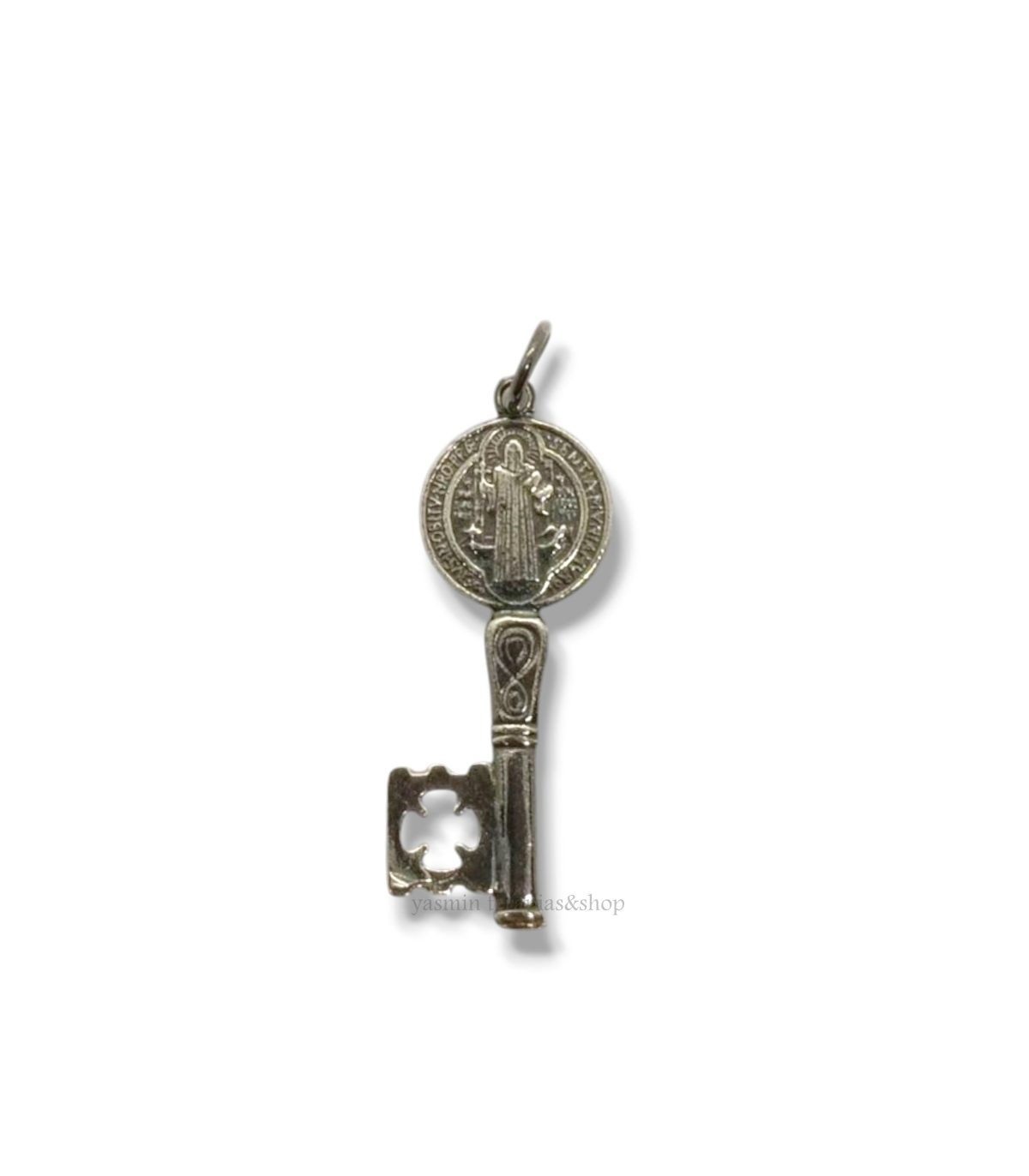 Pendentif clé de saint Benoît en argent massif 925. Puissant talisman contre les malédictions, sa forme de clé symbolise l'ouverture des chemins qui semblent bloqués.