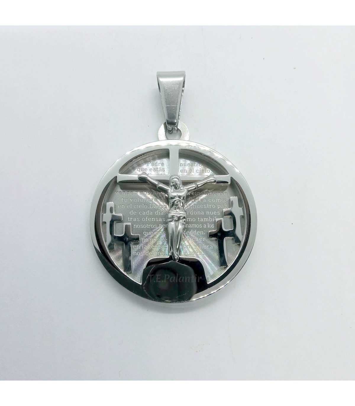 Pendentif crucifix avec la prière du Seigneur gravée sur le fond. Fabriqué en acier inoxydable, d'une taille de 3 cm. de diamètre, c'est la pièce parfaite pour emporter avec nous la protection et le plus grand symbolisme de la religion chrétienne. Livré avec une chaîne en acier inoxydable.