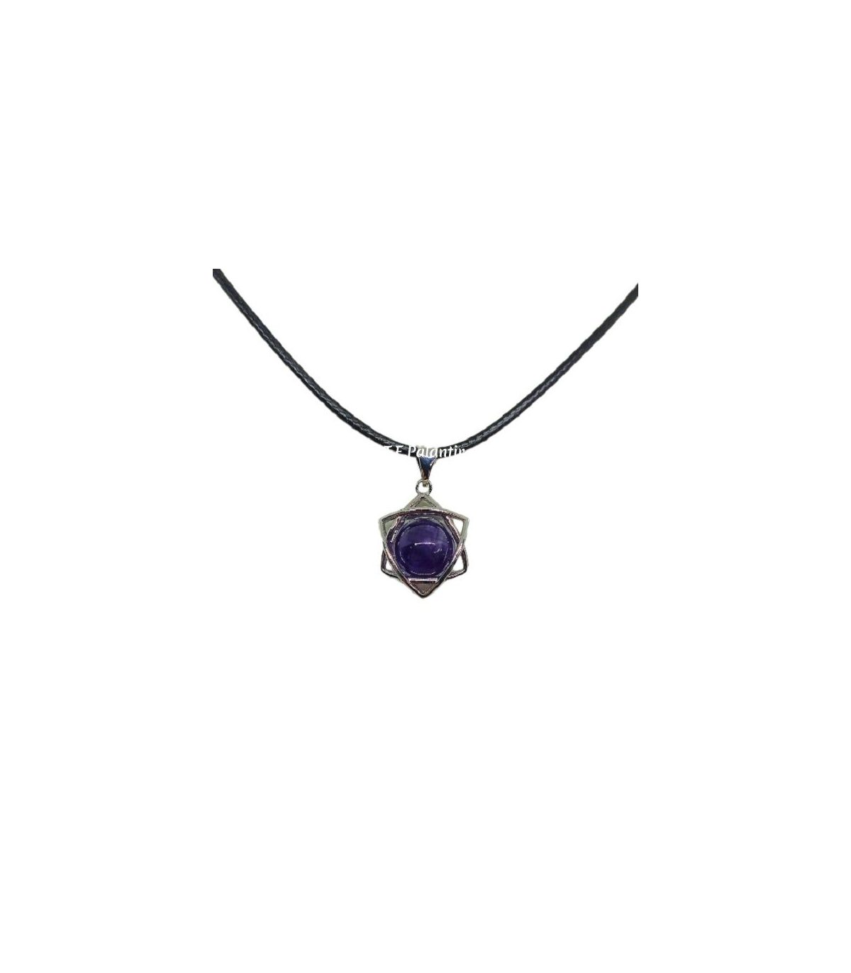 Pendentif étoile de David avec boule d'améthyste de 10 mm. à l'intérieur, en métal argenté de première qualité. (Pas d'argent). Taille du pendentif 15x15x8 mm. Livré avec cordon coton réglable ou chaîne boule acier (au choix).