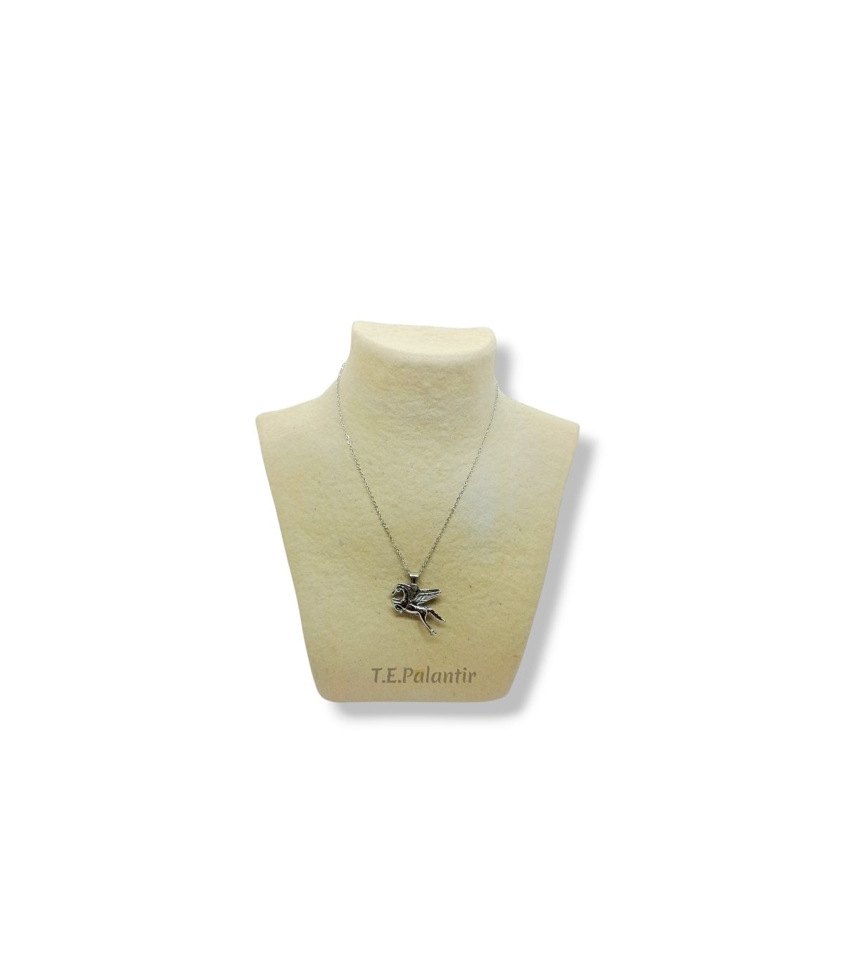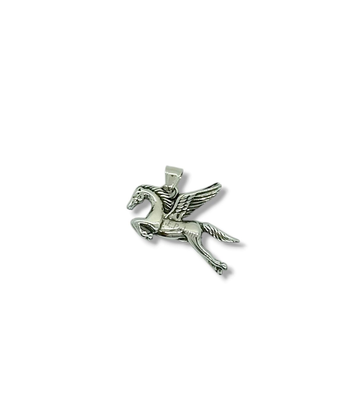 Pendentif Pégase, cheval ailé par excellence, figure de la mythologie grecque. Il symbolise la lutte et le courage. En acier inoxydable, il mesure environ 40 x 30 mm. Chaîne en acier inoxydable de 50 cm incluse.
