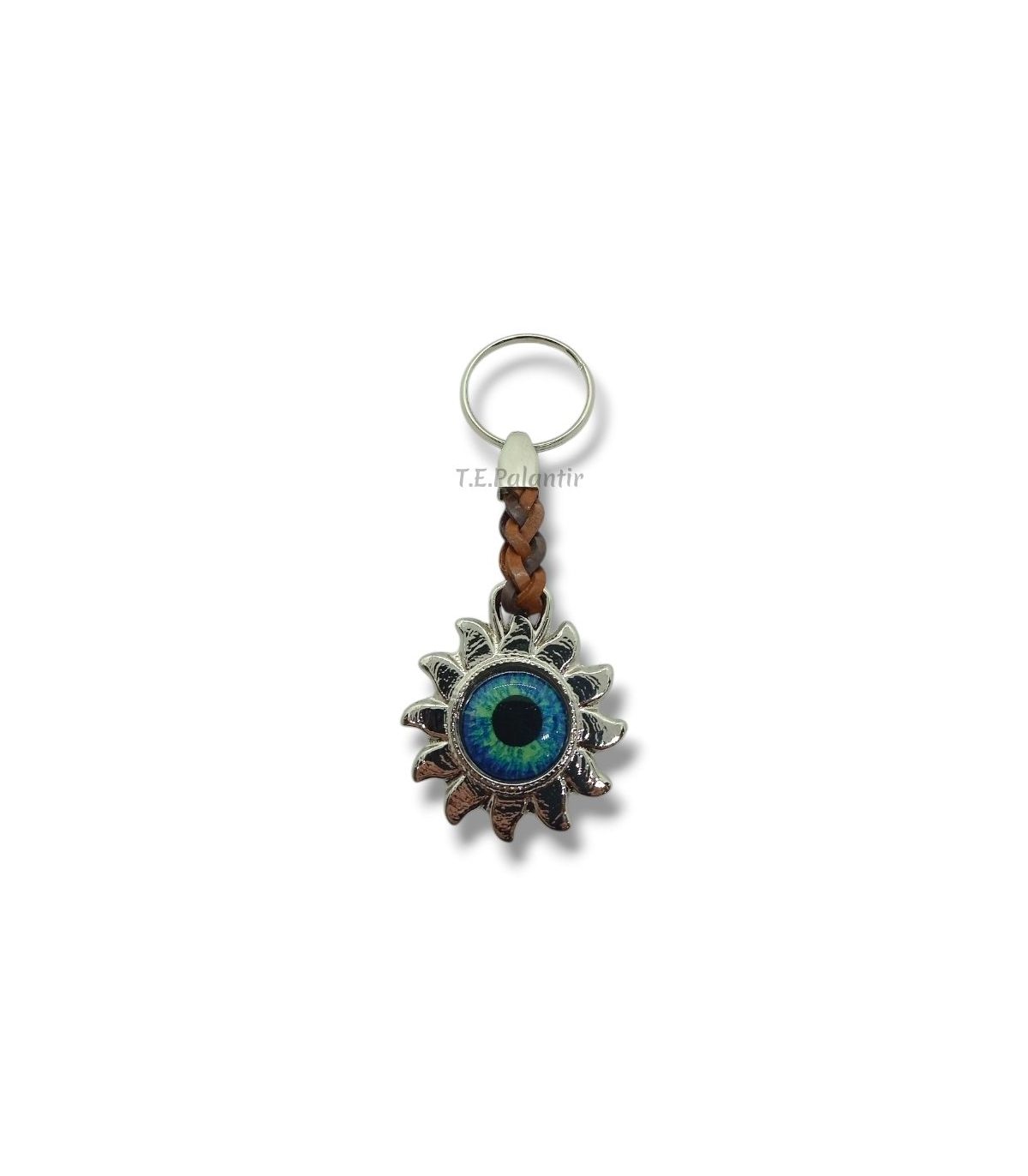 Porte-clés avec une figure de soleil avec un mauvais œil turc central, représentant la force et la protection, en métal argenté. Union avec cuir tressé marron. Longueur du porte-clés : 9 cm. environ
