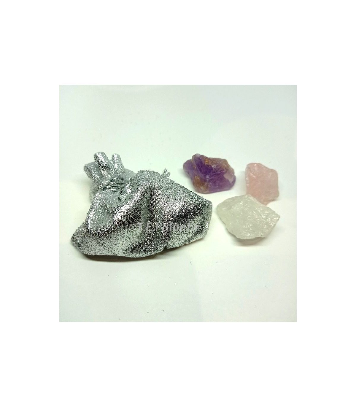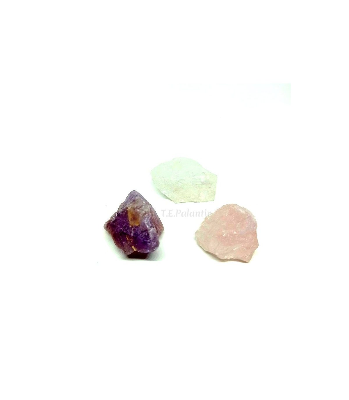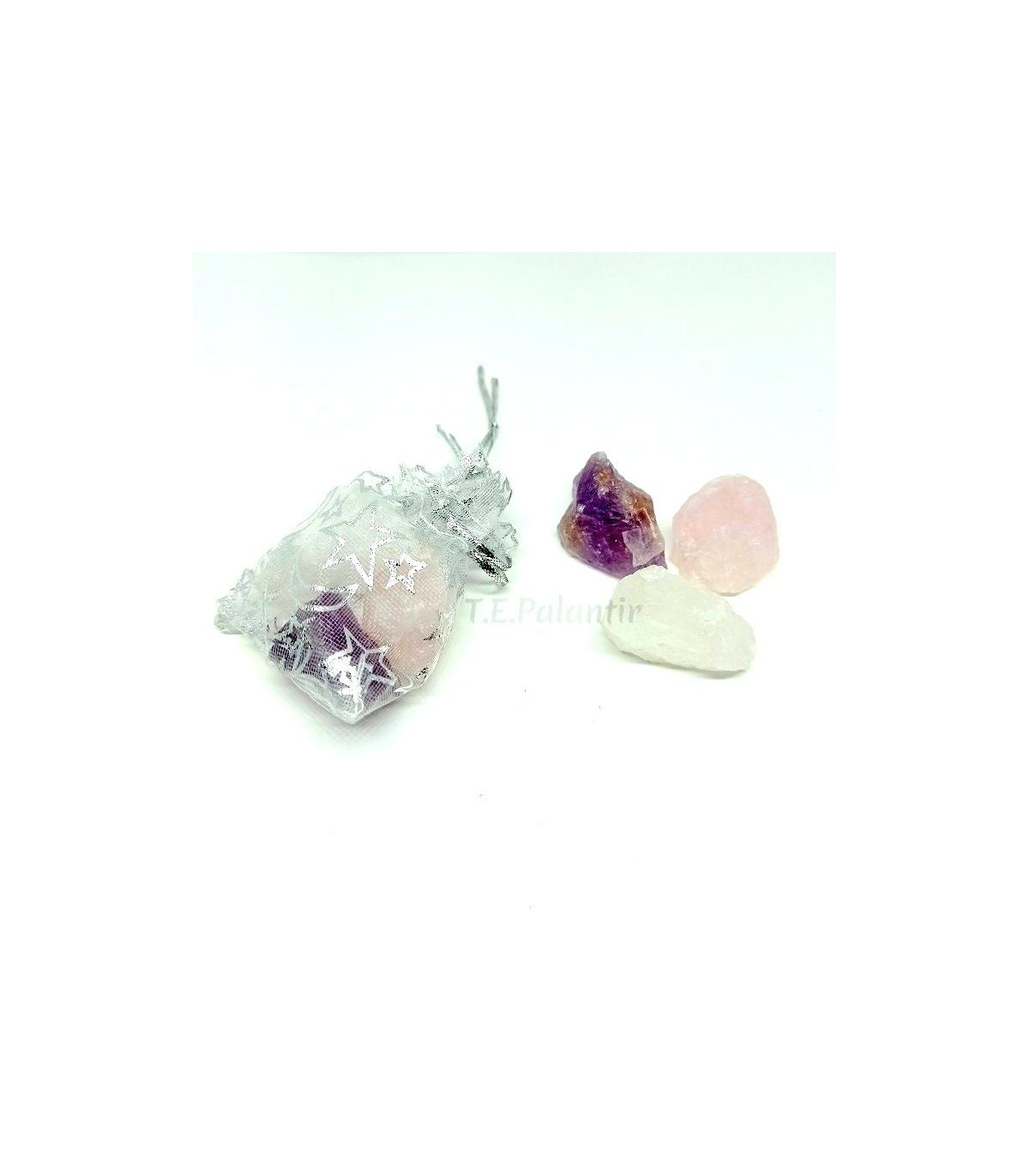 Améthyste, quartz blanc et quartz rose, pièces naturelles brutes, présentées dans un sachet en tissu décoré. Taille des pierres : 25-30 mm. environ.