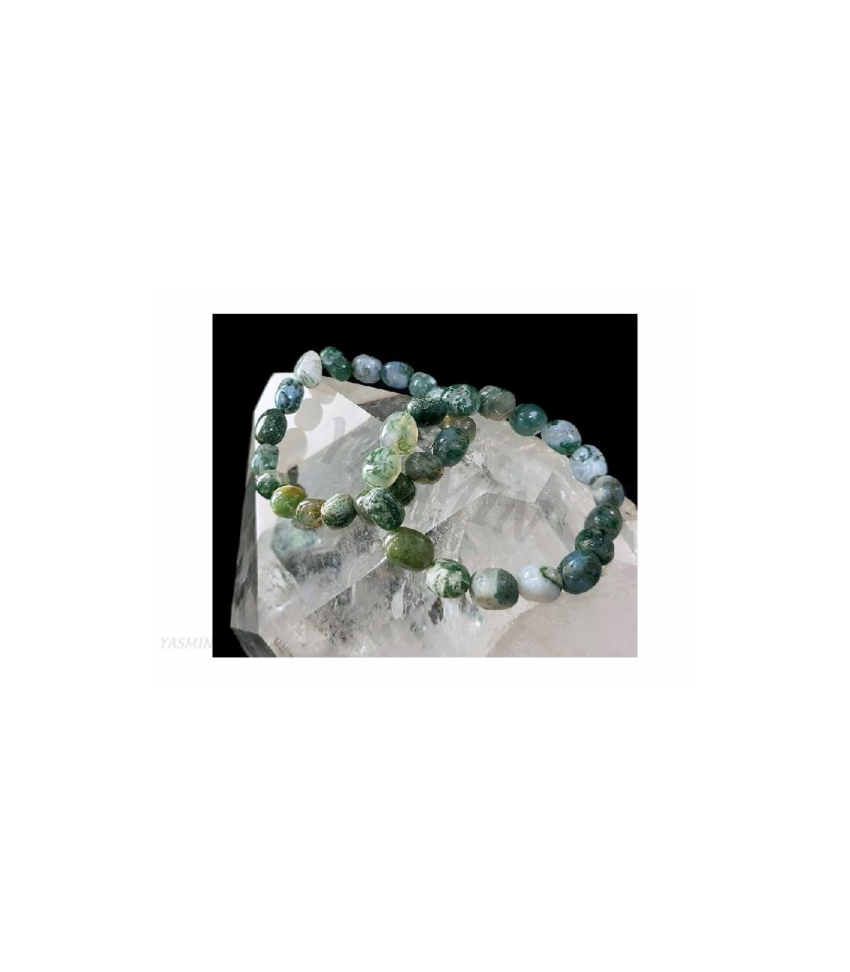 Bracelet en agate d'arbre, formé de pierres roulées de 10-15 mm. de ce beau minéral. Élastique adaptable.