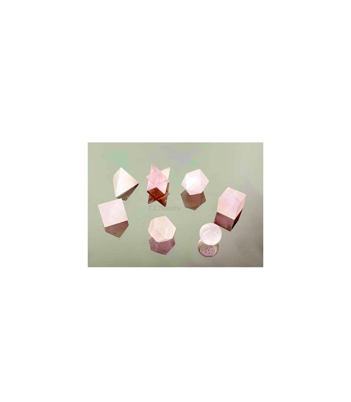 Pack de 7 solides platoniques de quartz rose, dans un étui design. Les pièces mesurent 10x10 mm.