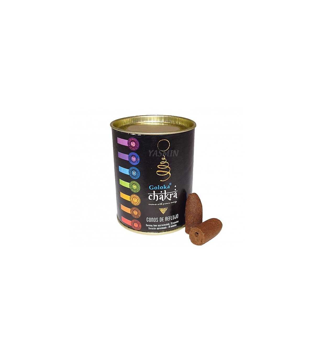 Cônes d'encens GOLOKA 7 Chakras type reflux, effet chute d'eau. Maintenant la qualité aromatique de GOLOKA dans votre brûleur en chute d'eau. Avec ces cônes d'encens, nous obtenons la belle décoration de l'effet chute d'eau de la fumée, et un parfum de haute qualité, ainsi qu'une atmosphère très relaxante. Boîte avec 18 cônes d'une durée de 20 minutes environ.