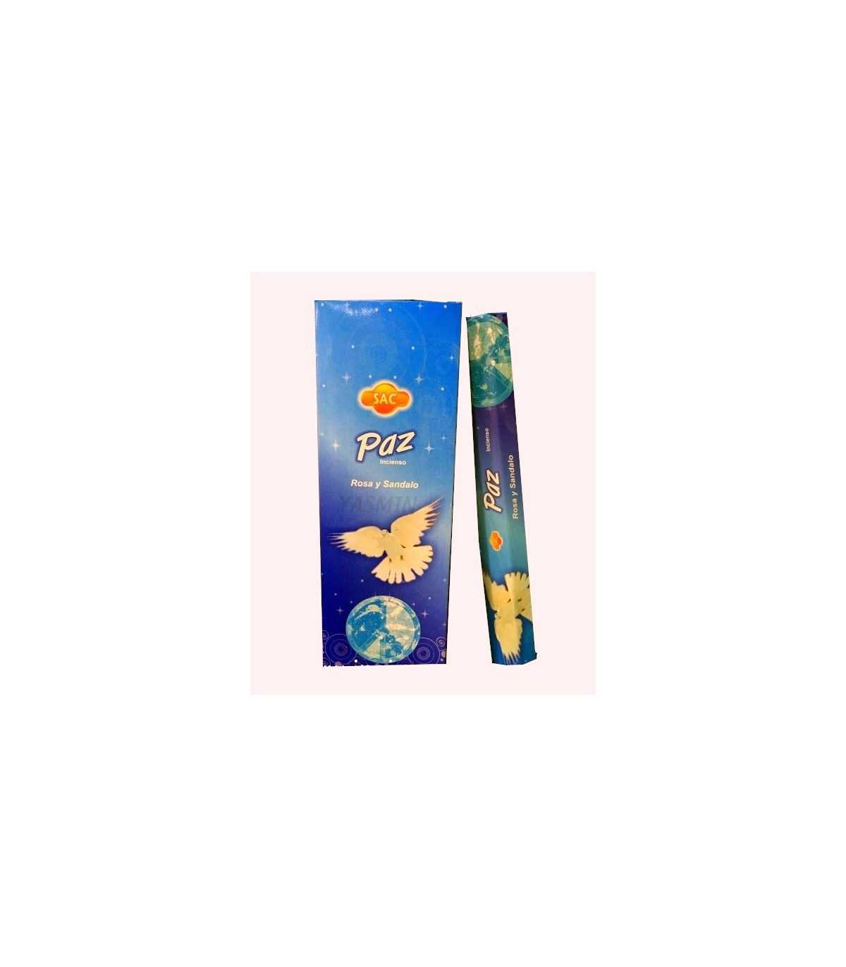 Encens de paix SAC. Un encens avec un mélange parfumé de bois de santal et de rose, qui nous aidera dans notre objectif de trouver la paix physique, spirituelle et émotionnelle. C'est l'antidote parfait après une journée de stress. Boîte de 20 bâtons.