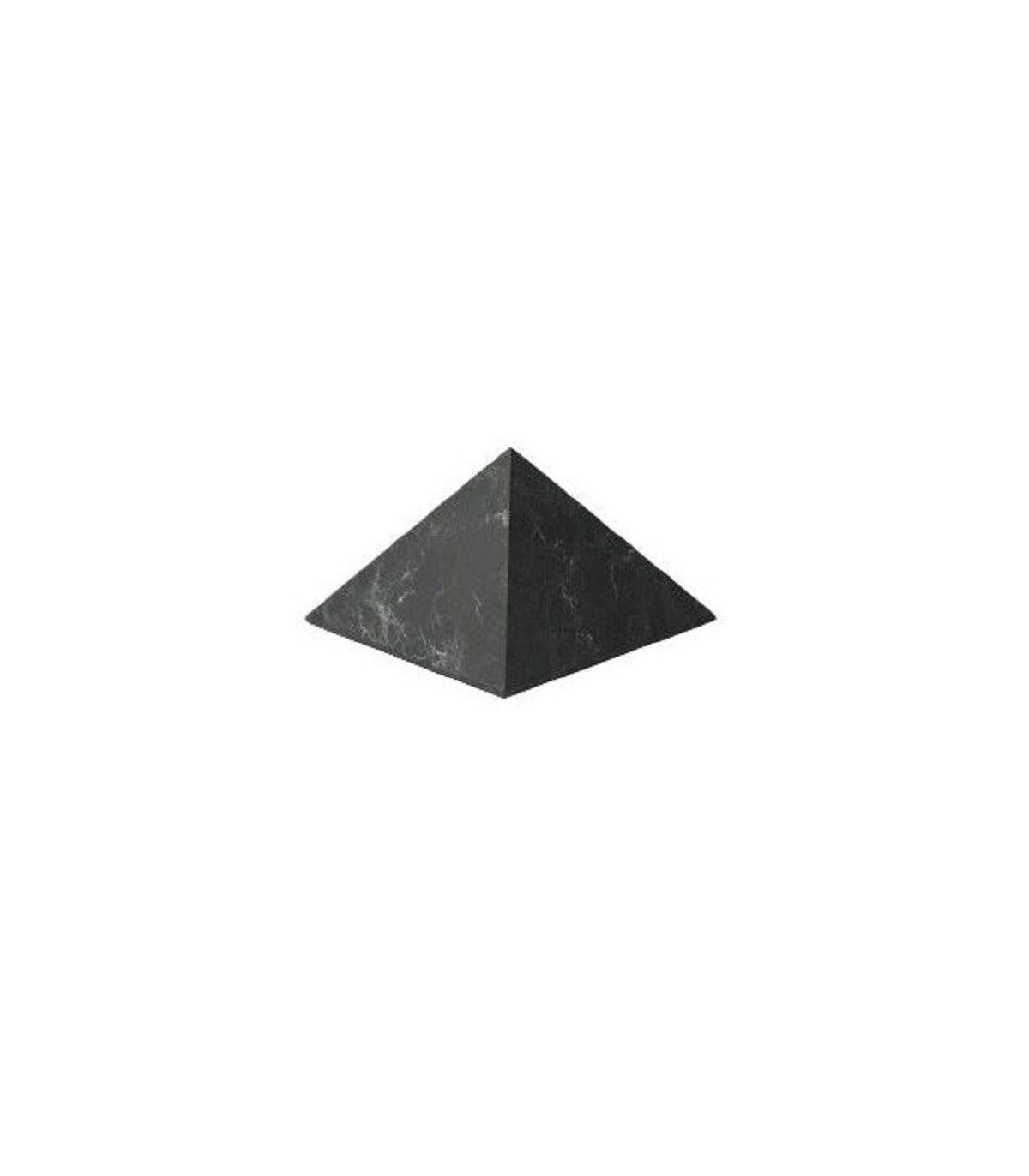 Pirámide de Shungit 100 % natural (sin pulir) de 5x5 cm. de base. Indicamos que no está pulida porque está tallada en la piedra natural, no se ha procedido a su pulido, y por tanto no incorpora la fina capa de pulimento que se aplica a las pirámides y otras figuras ya pulidas.