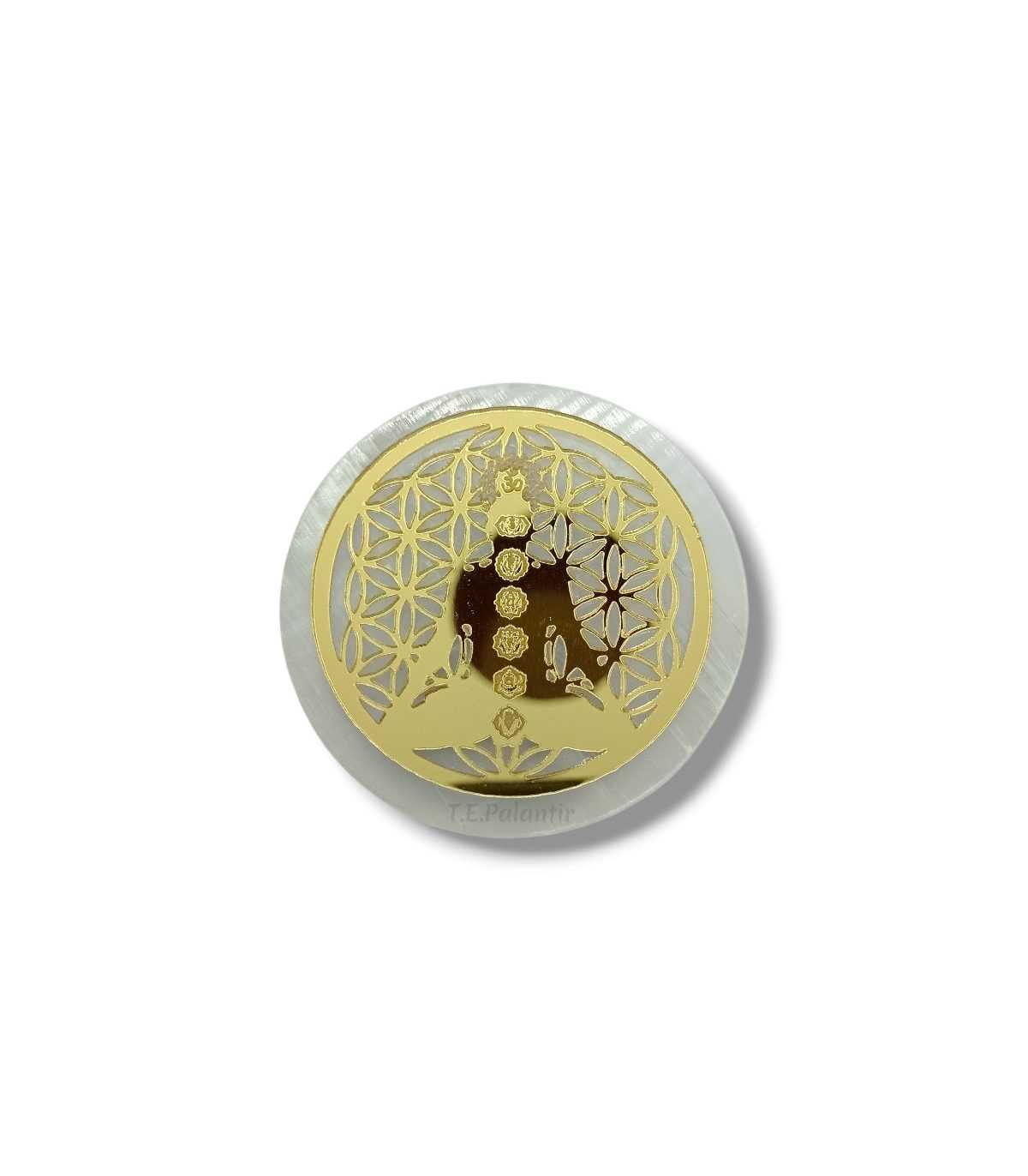 Plaque de sélénite avec 7 chakras et un Bouddha doré de forme circulaire, d'environ 80 mm de diamètre. Idéale pour se ressourcer et créer un petit autel dans n'importe quel coin de la maison.