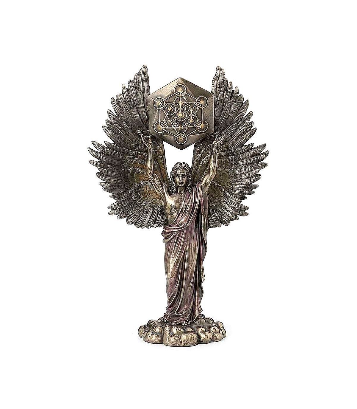Figure de l'Ange Métatron avec un cube géométrique, en résine, finition bronze. L'ange Metatron se considère comme un messager et un transmetteur des ordres de Dieu. Pour sa part, le cube Metatron est lié à la géométrie sacrée et contient en son sein la plupart des formes que l'on peut trouver dans la nature.