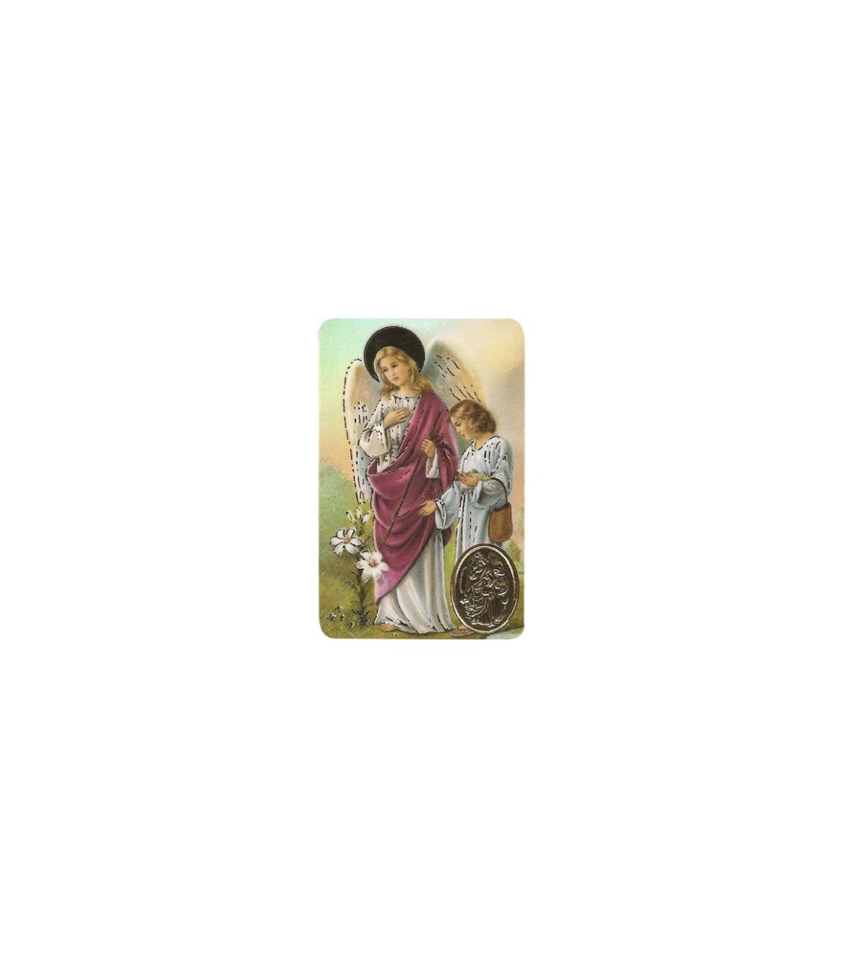 Estampillé de la médaille de l'Archange Saint Raphaël, image classique. Comprend la prière au revers. Dimensions: 85x54 mm.