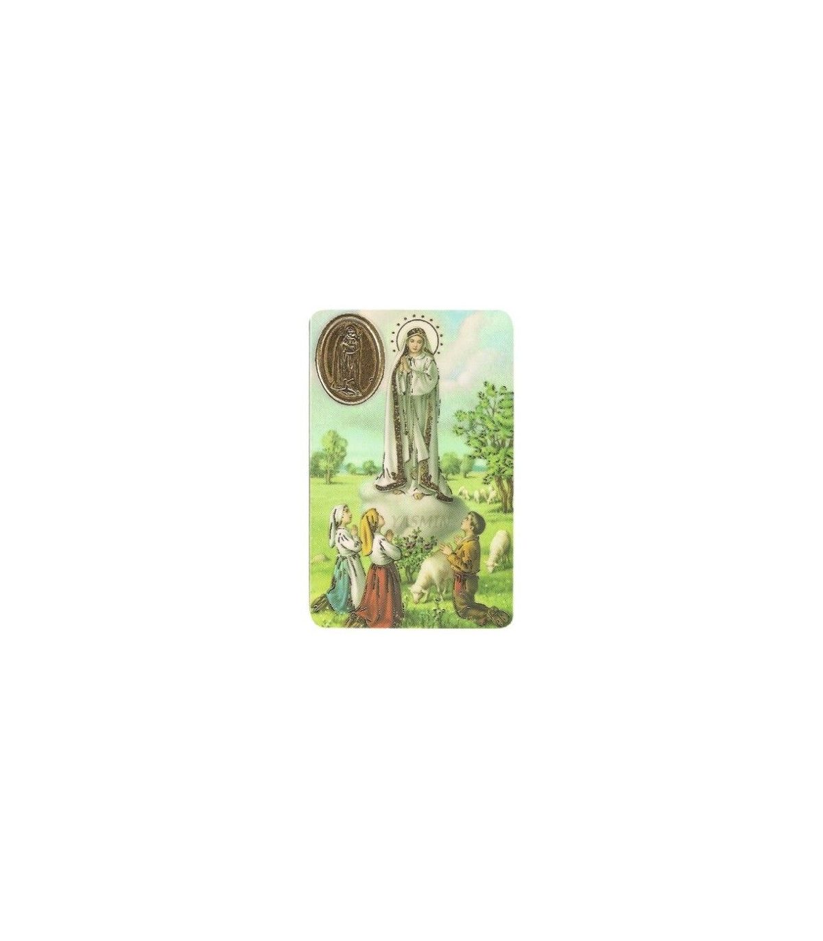 Estampa con medalla de la Virgen de Fátima. Incluye oración en el reverso.