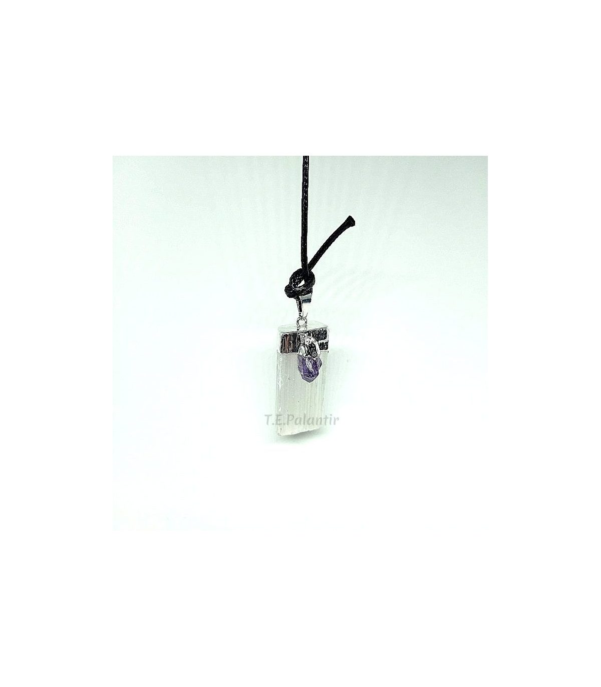 Pendentif en sélénite qui incorpore une petite pointe d'améthyste, ce qui augmente la beauté qu'offre déjà la sélénite. La sélénite est une composition de plâtre cristallisé, qui stabilise et équilibre notre corps. Il a un aspect extérieur blanc translucide, ce qui le rend très élégant et captivant. Son nom vient de la déesse grecque Selene, qui est la déesse de la lune. Il aide à se débarrasser des négativités, il nous donne de la clairvoyance. La sélénite est une pierre féminine, comme toutes les pierres de lune. Il est indiqué pour aider dans tout ce qui concerne la fertilité