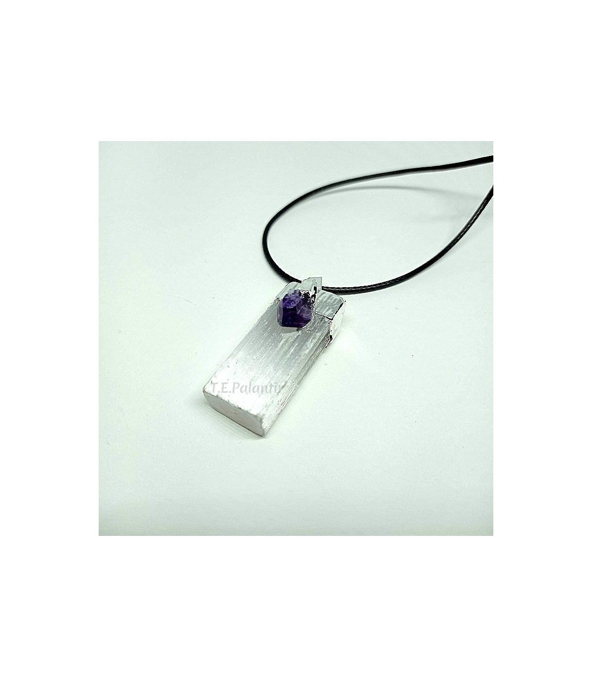 Pendentif en sélénite avec une petite pointe en améthyste, serti dans un bain électrolytique. Format 30x15mm. Comprend un cordon de coton noir réglable.