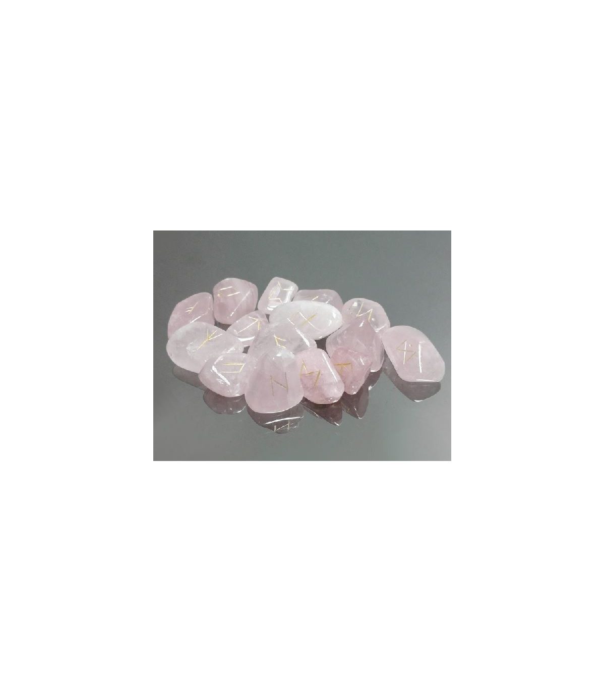 Juego de runas de cuarzo rosa. Compuesto de 25 piezas de cuarzo rosa con el alfabeto rúnico grabado en ellas.