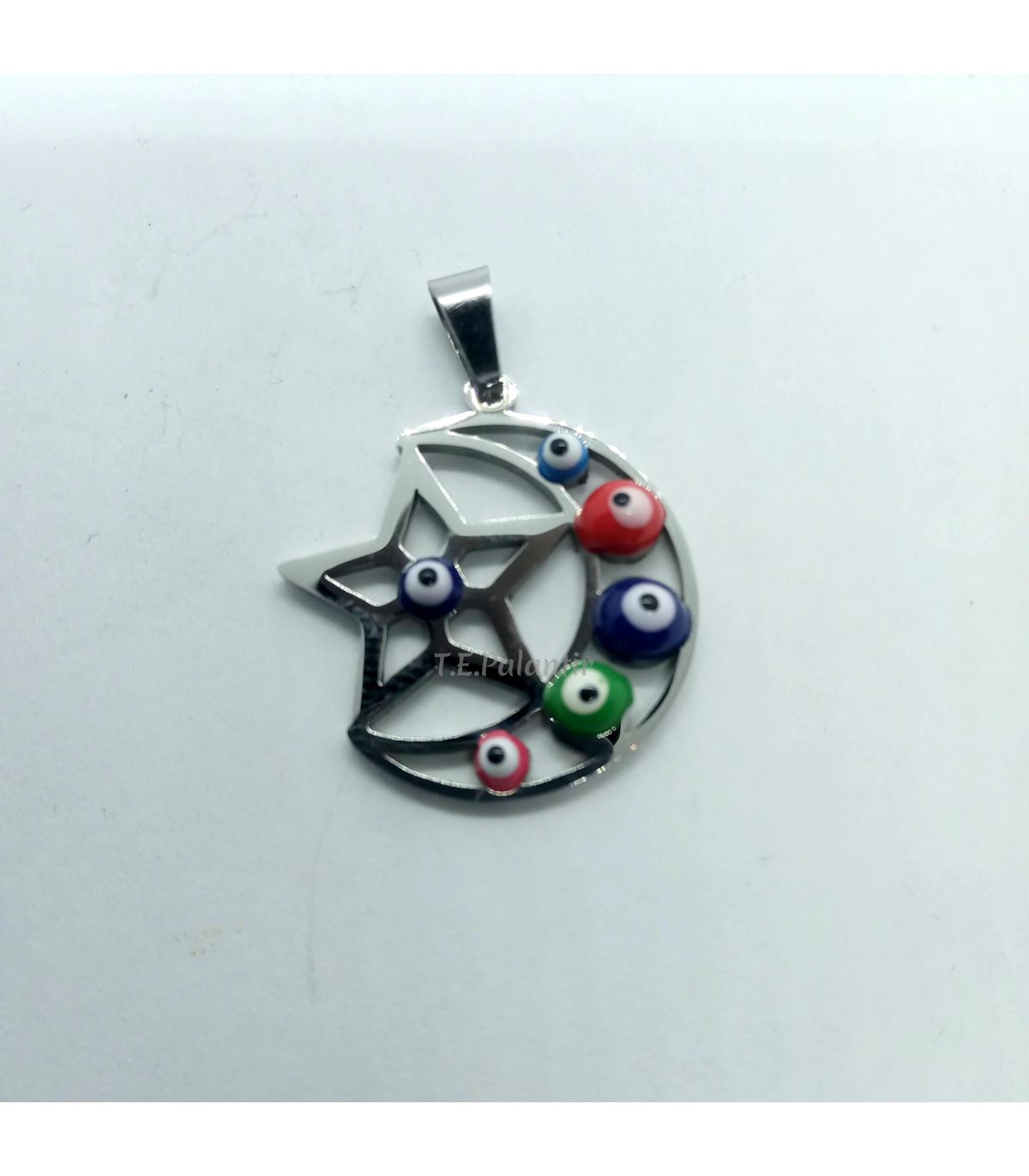Moon - Star pendant with Turkish eyes, stainless steel, size 25x23 mm. Supplied with waxed cotton cord, adjustable with knots or 50 cm stainless steel chain. long (to choose).