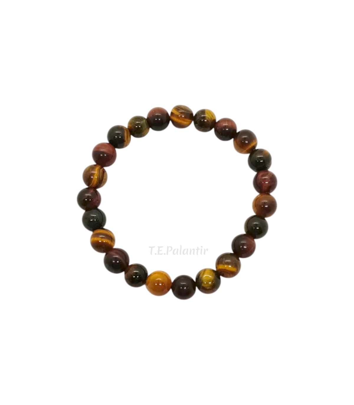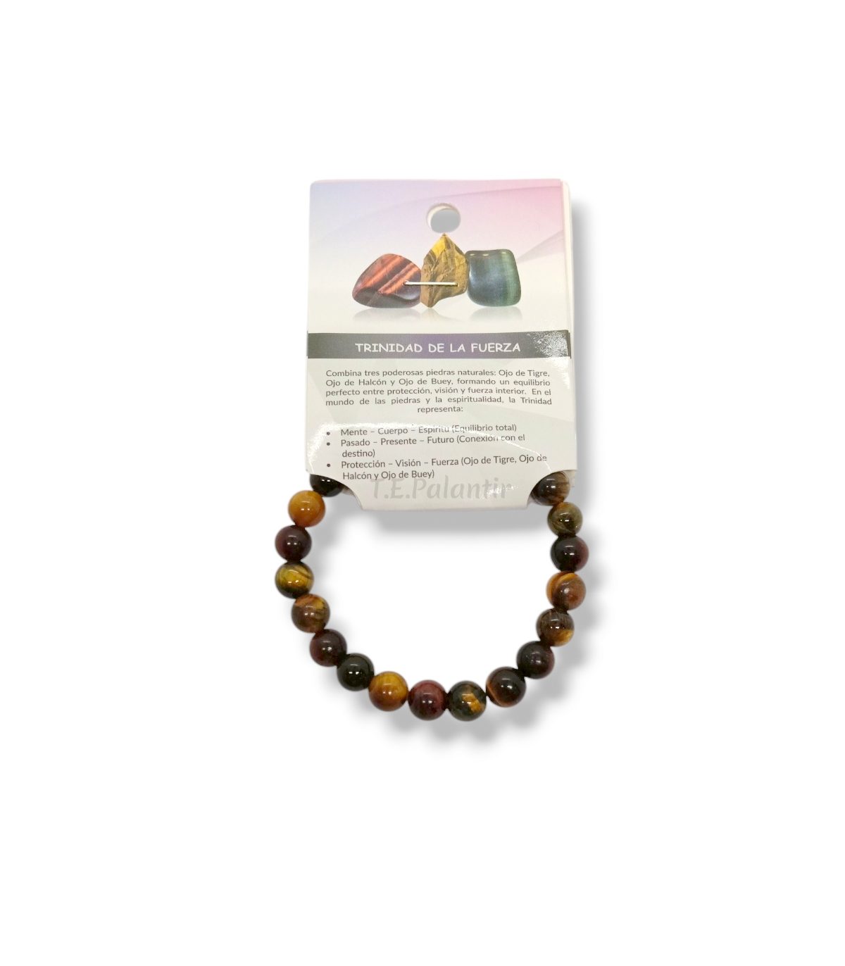 Trinity of Strength bracelet, made of the minerals tiger's eye, hawk's eye, and ox's eye. Made with 8 mm beads of these stones. This bracelet is also known as the three-eye bracelet.
