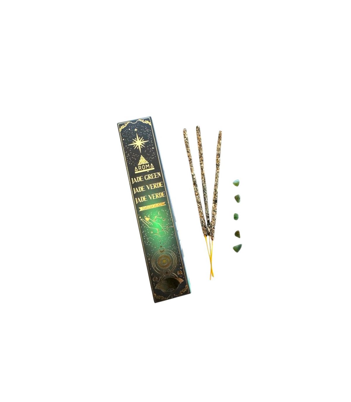 Incense made with a combination of natural aromas formulated to enhance the magical properties of green jade, a stone associated with prosperity, wisdom and spirituality. The case contains 8 incense sticks and a box with 4 mini green jade stones (approx.). The duration of the incense sticks is approximately 1 hour.