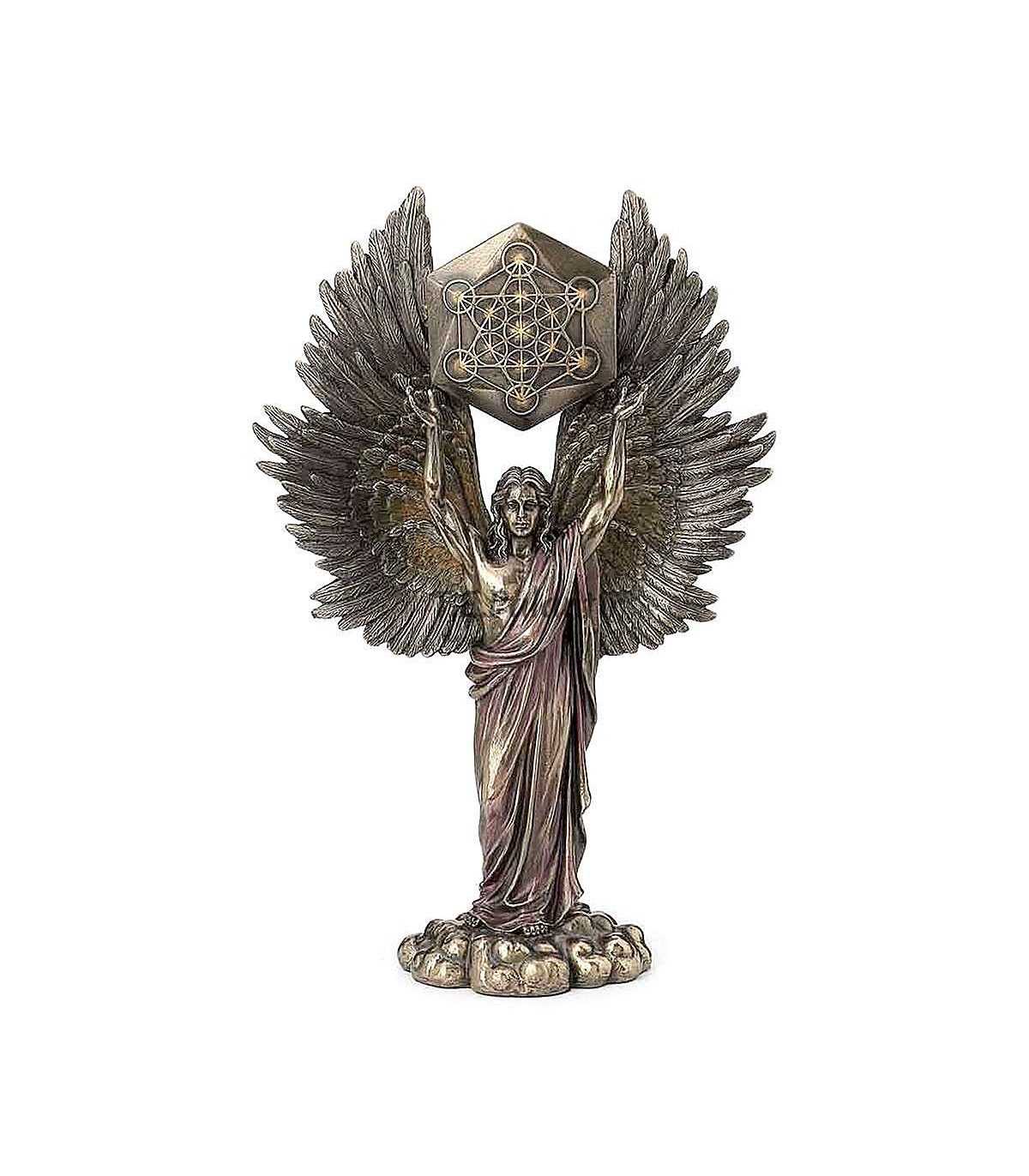 Figure of the Angel Metatron with a geometric cube, made of resin, bronze finish. The angel Metatron considers himself a messenger and transmitter of God's orders. For its part, the Metatron cube is related to sacred geometry and contains within it most of the shapes that can be found in nature.
