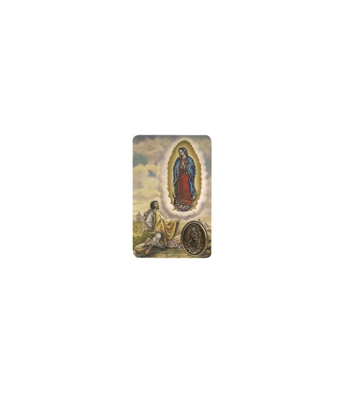 Print with medal of Our Lady of Guadalupe. Includes prayer on the reverse. Size: 85x54 mm.