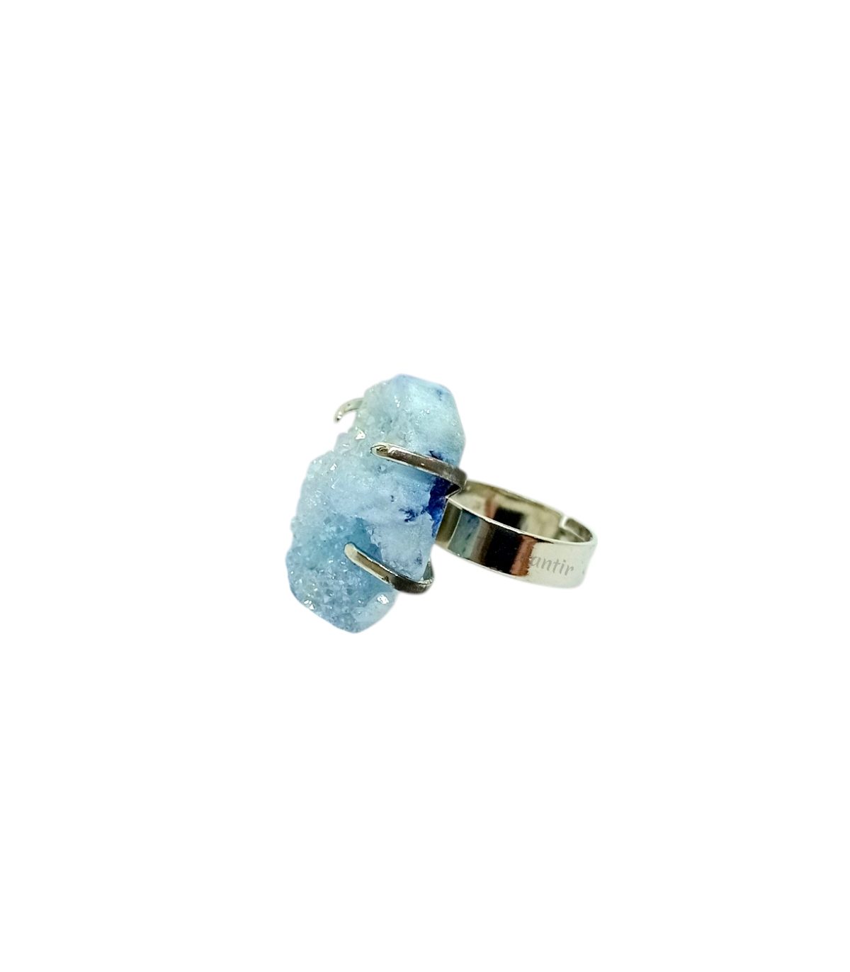 Ring with quartz aqua aura in adjustable size, silver metallic (not silver). The quartz aqua aura is a quartz that has been treated with noble metals (gold, silver, cobalt, etc ..) to give it a special appearance in terms of colors and shades, which vary depending on the treatment received.