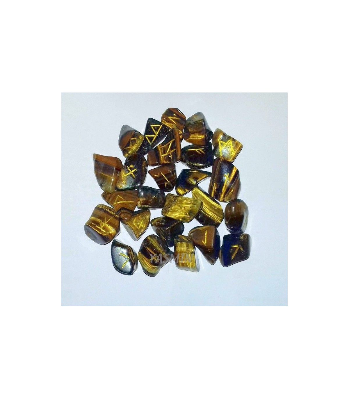 Juego de runas de ojo de tigre. Compuesto de 25 piezas de dicha piedra grabadas con el alfabeto rúnico.